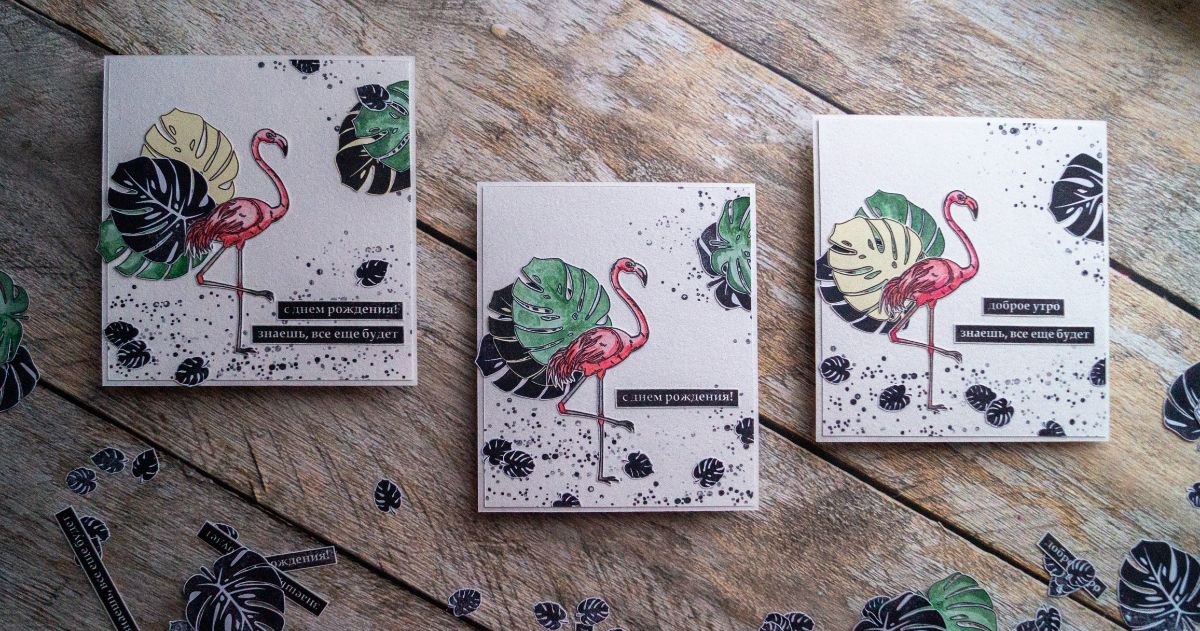 И снова открытки в моём штамповом творчестве. В этот раз вдохновение было банально простым. Просматривая разделы со штампами, я наткнулась на каталог "Надписи и картинки для открыток. Тропики", где увидела штамп "Фламинго". И всё, меня накрыла ностальгия, вспомнилась песня, где фигурирует эта чудесная птица "Розовый фламинго — дитя заката, розовый фламинго здесь танцевал когда-то..." И вот так просто возникло желание сделать открытки с тропической тематикой.