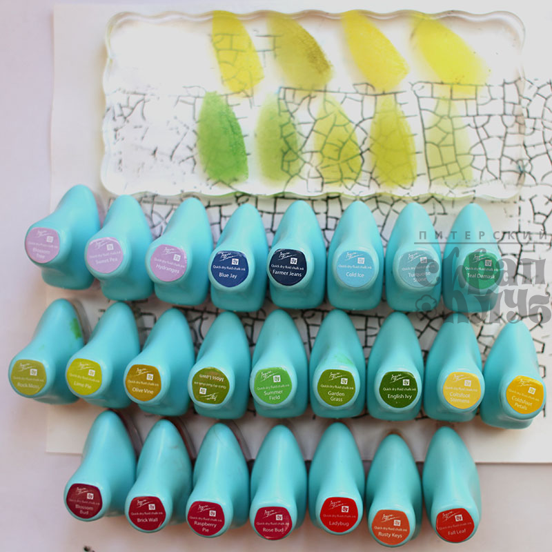 Далее самый интересный этап – раскрашивание. Выполнить его можно любым известным вам способом: акварелью, акриловыми красками, маркерами или цветными карандашами. Я же являюсь счастливой обладательницей большой палитры меловых чернил. Именно с их помощью я и решила раскрасить мозаику. Все просто: на пластиковую палитру или акриловый блок нанесем чернила, сбрызнем водой и нанесем на бумагу мягкой кисточкой. Также можно воспользоваться кисточкой с резервуаром для воды.