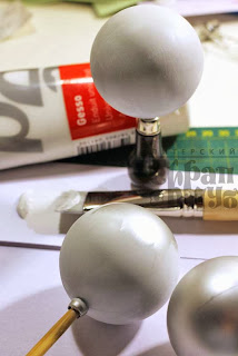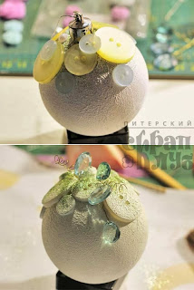 - на белый шар я наклеила несколько пуговиц разного размера, затем нанесла ещё раз слой грунта при помощи спонжа и посыпала блестками. Также добавила несколько акриловых