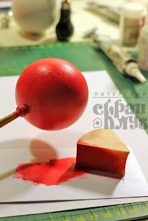 На бледно-розовый шар я выдавила толстую каплю белого грунта, на кончике зубочистки добавила розовую акриловую краску и распределила её (но не размешала), получив не равномерный цвет, а мраморные разводы. После этого спонжем промокнула получившуюся массу со всех сторон, оставив таким образом на поверхности шарарельеф.