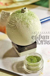 Посыпала сухими блестками и отставила сохнуть. Точно таким же образом я поступила и с белым шариком, но не добавляла цветную краску, а блестки использовала зеленые.