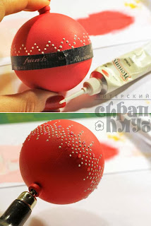 После высыхания краски я взяла самый яркий шар, наклеила по «экватору» полоску бумажного скотча для ориентира и нанесла точечный узор белым контуром. Затем отклеила скотч и завершила узор.