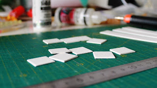 Сначала нарежем из толстого картона заготовки – небольшие квадратики ( у меня 2х2 см):