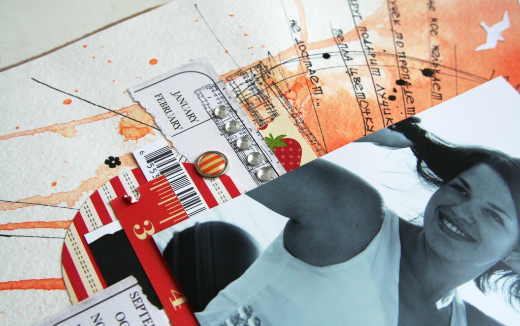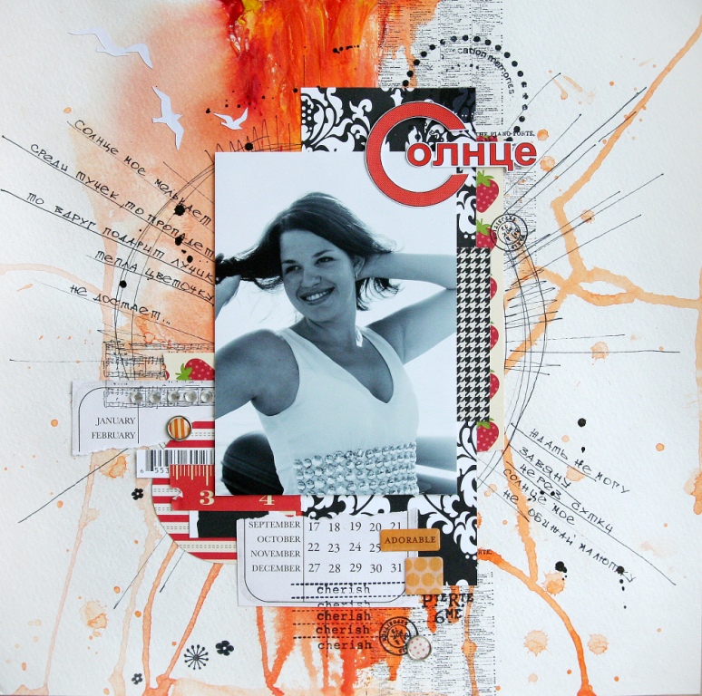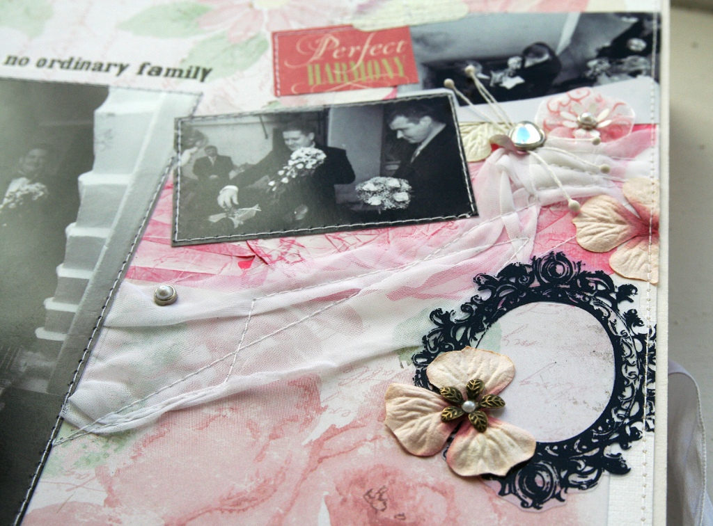 Не смотря на свой викторианский дизайн черно-белую бумагу можно использовать независимо от стиля, и она просто незаменима в работе с черно-белыми фотографиями. В подтверждение своих слов я сделала вот такую работу в самом что ни на есть фристайловом исполнении с использованием двух принтов бумаги.