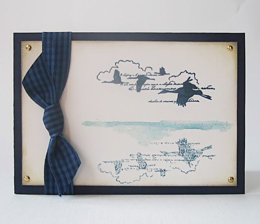 - Любые штампы. Лучше всего подойдут такие, которые изображают объекты, чаще всего отражающиеся в воде. Например, птицы, деревья и кусты, ряды домиков и т.п. Я для своей открытки использовала штампик «Журавли».