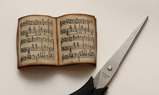 У нас получилась книжечка с нотами, но она выглядит плоско. Чтобы придать ей объем - вытягиваем каждый ее листик ножницами, двигаясь от корешка к краям страниц, располагая ножницы как на рисунке: