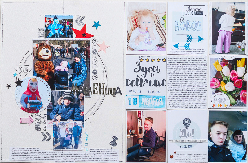 Делюсь очередной оформленной неделей Проекта жизнь. С каждым днем все больше начинаю использовать штампы в своих разворотах. Они добавляют очень яркие акценты к готовым карточкам и делают развороты разнообразными.