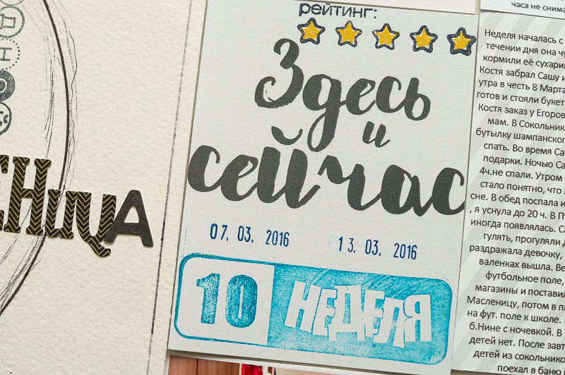 Для карточек использовала штампы из набора «Неделя», штамп «Фразы», «Важно преважно» и мой любимый «Рейтинг» – его использую во всех разворотах.