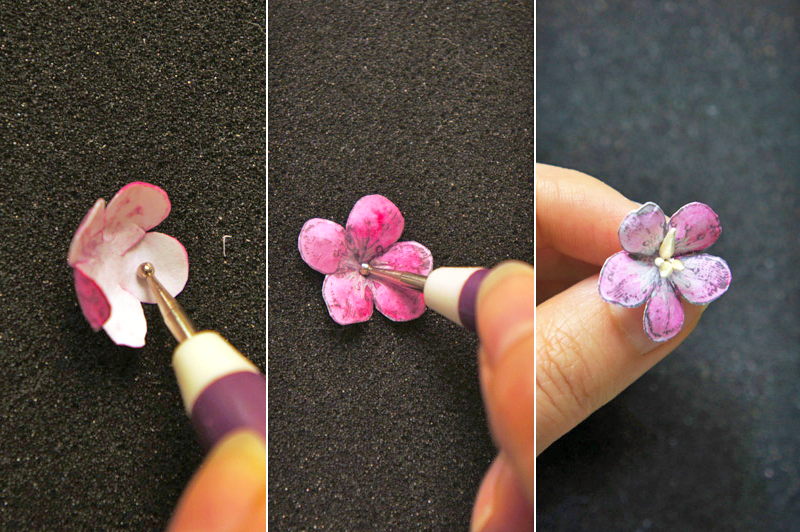 С обратной стороны смачиваю цветок водой и, круговыми движениями, делаю лепестки выпуклыми. На лицевой стороне формирую вогнутую сердцевинку, прокалываю середину шилом и вставляю тычинки.