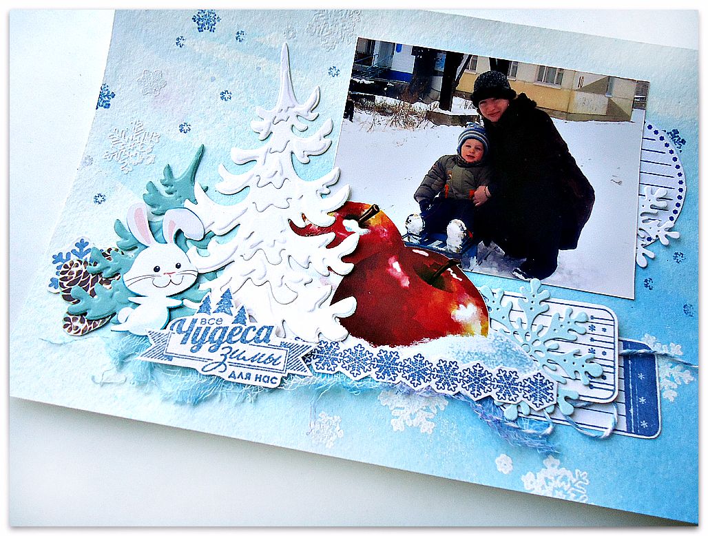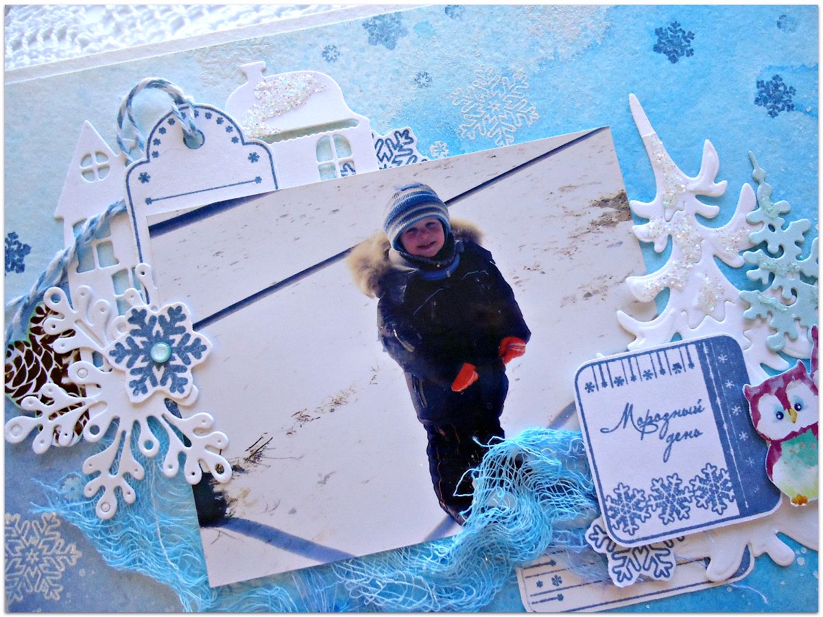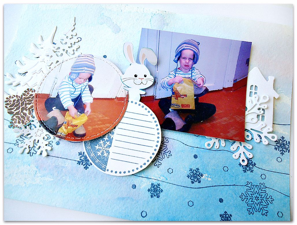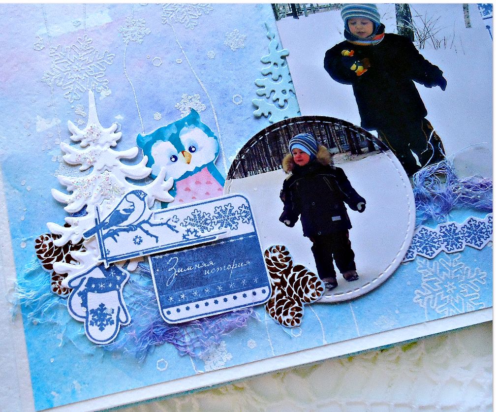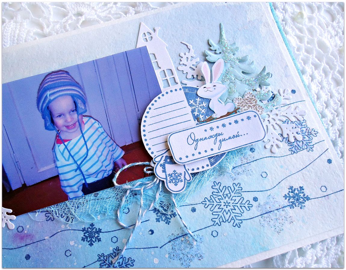 И вот так "Однажды зимой..." - фраза из набора штампов подошла идеально, собирался мой маленький сын гулять. С помощью вырезанных элементов - журналинга зимнего круглого, надписи, рукавичек получается основная композиция отражающая ситуацию на фото.