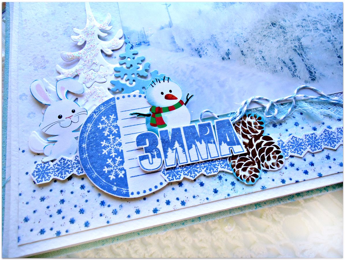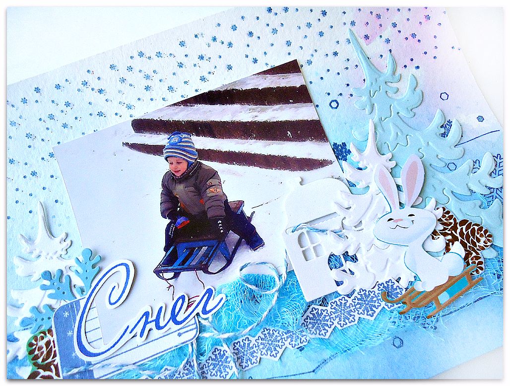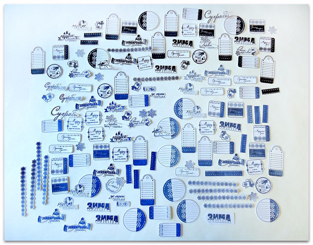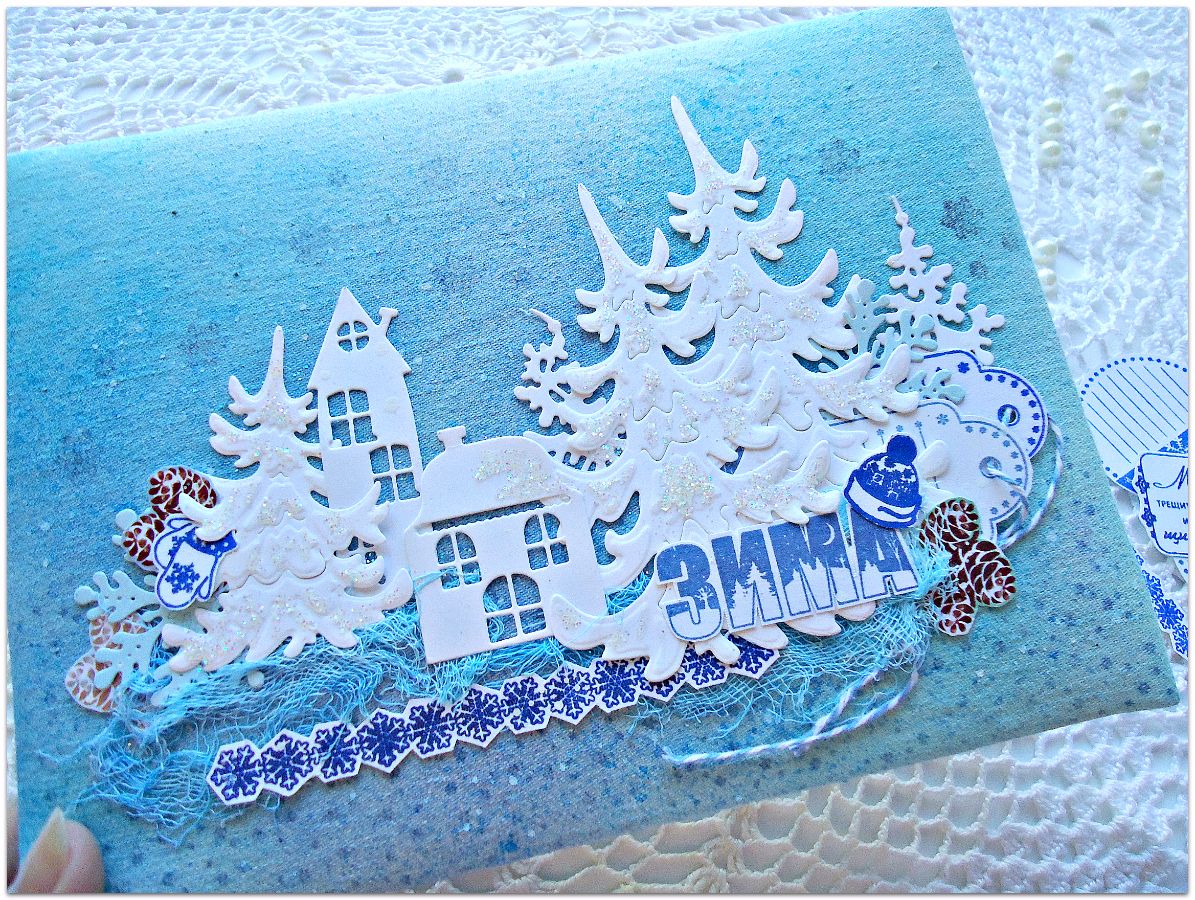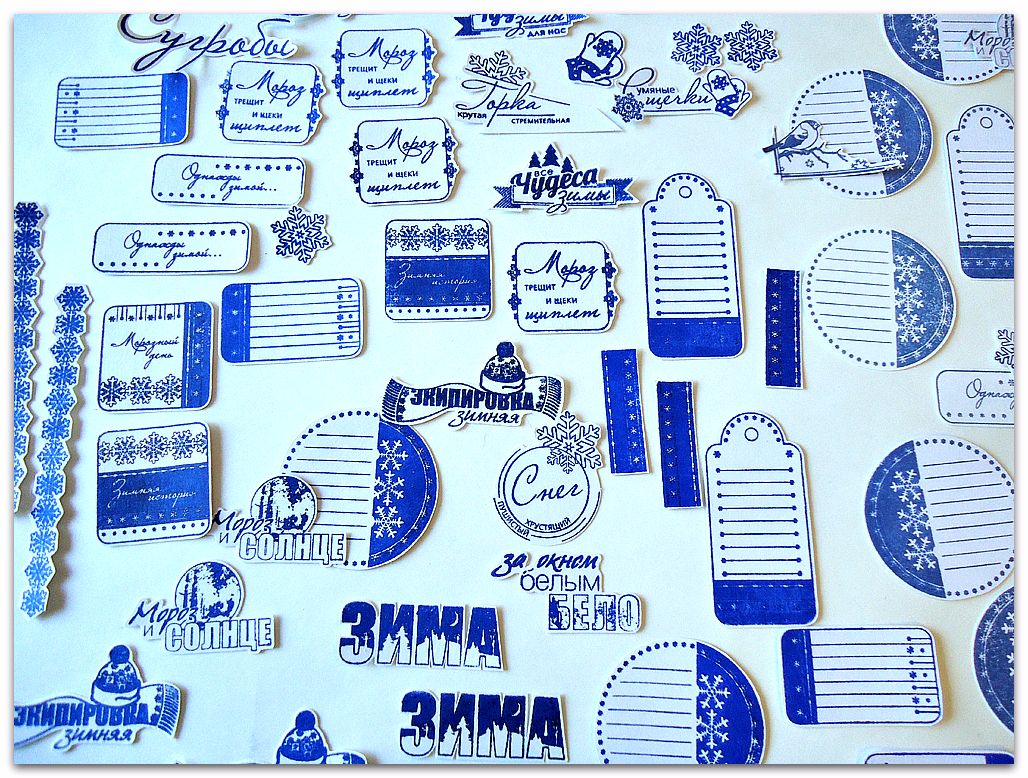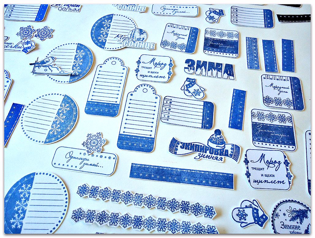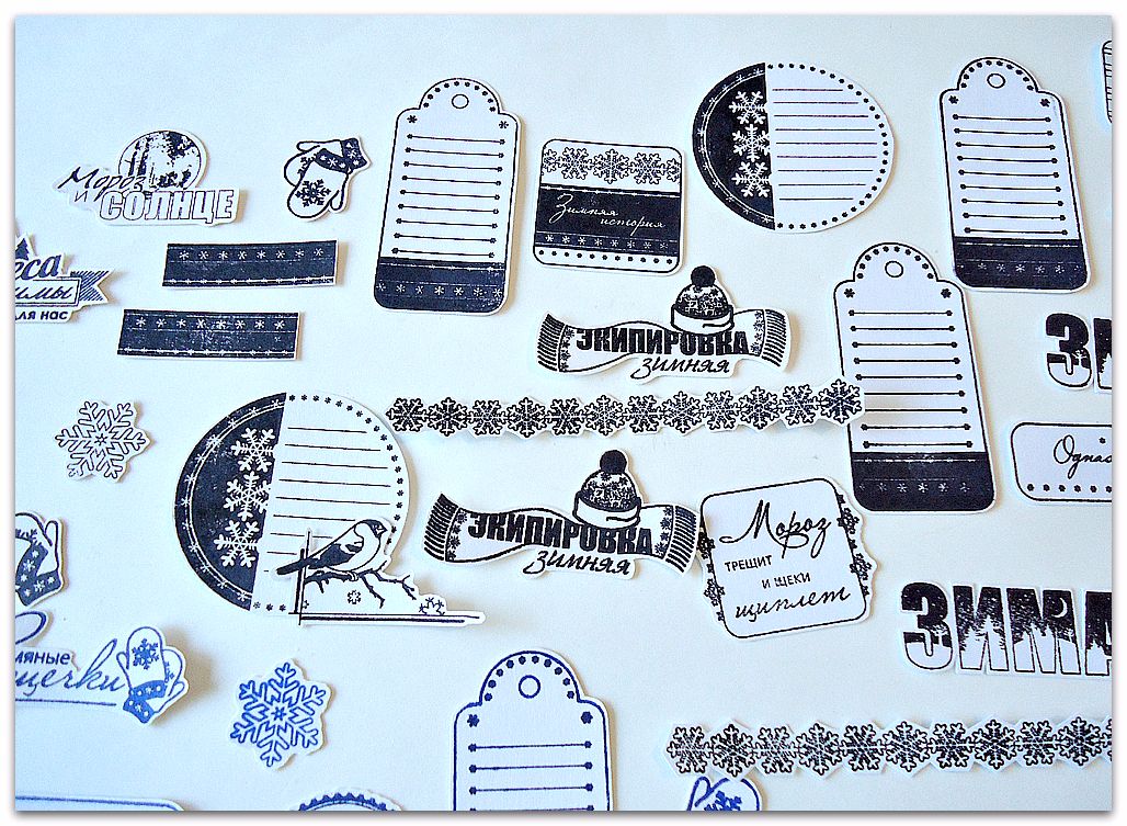 Штампы были приклеены к акриловому блоку, но за счет мягкой поверхности оттиски получились не четкими. Опять же - получаем иллюзию идущего снега, который накрывает таежный городок. Вырезанные отштампованные элементы: журналинг зимний вертикальный, бордюр из снежинок, шапочку, рукавички, слово "Зима" двух разных оттенков синего (джинс и индиго) я выбрала для главной композиции и оттенила их белой вырубкой.