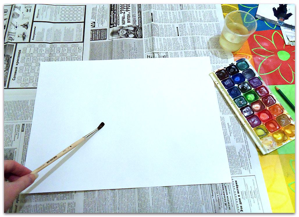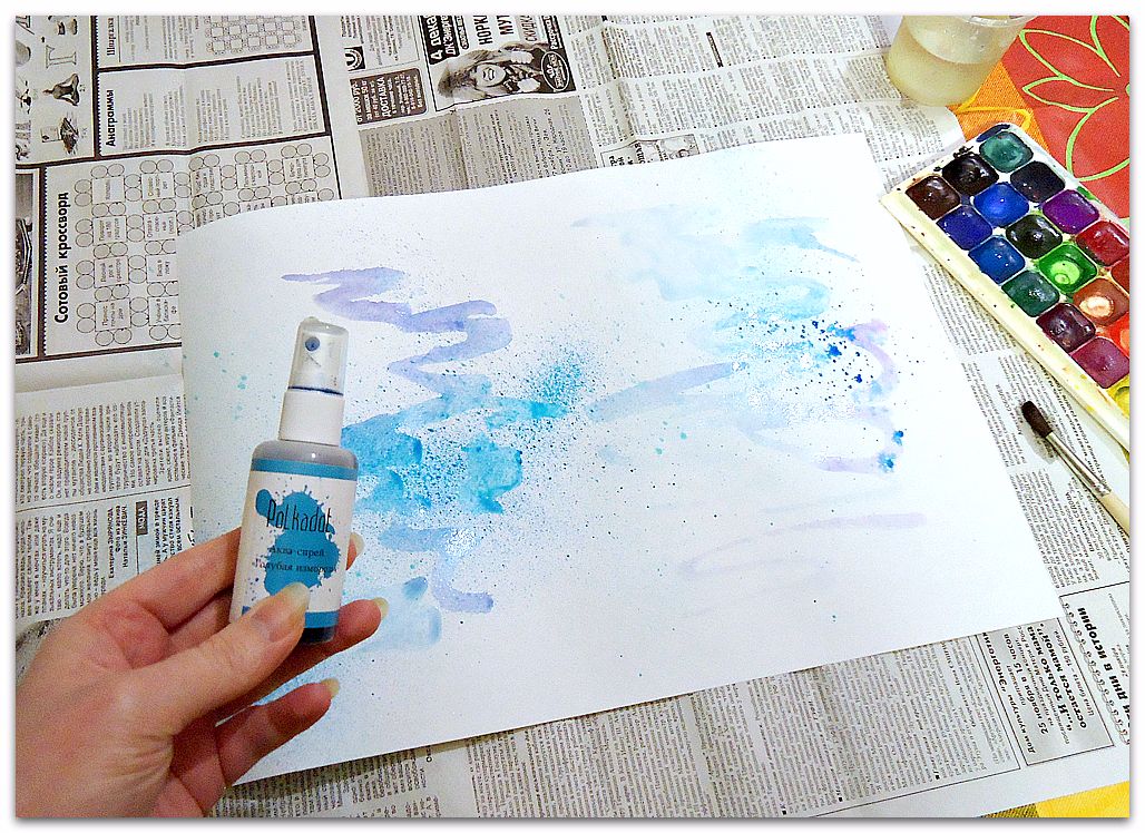 Приступаем к созданию фонов. Смачиваем кисточкой или сбрызгиваем пульверизатором акварельную бумагу.
