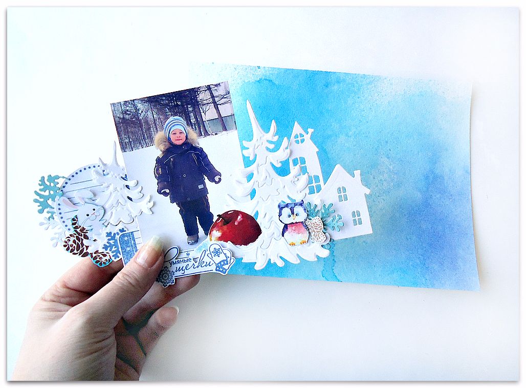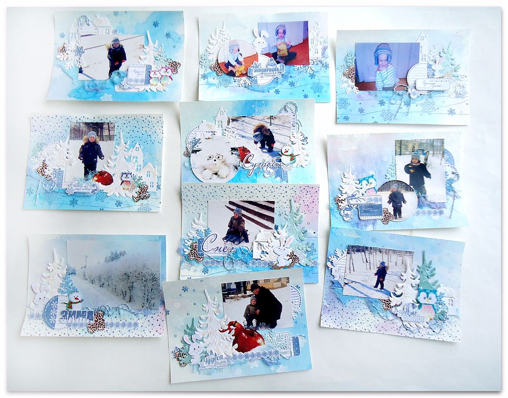 Бывает так, что не имея большого количества элементов для декора, мы сомневаемся получится ли оформить любимые фото красиво и интересно. Ответ, конечно, получится! Берите в руки штампы и не сомневайтесь, т.к. даже малая коллекция тематических штампов даст вам возможность объединяя в декоре фоновый штампинг, вырезанные элементы из бумаги и оттиски штампов, такие как журналинг вертикальный, журналинг горизонтальный, журналинг круглый, снежинки и рукавички, создавать разнообразные не повторяющиеся композиции.