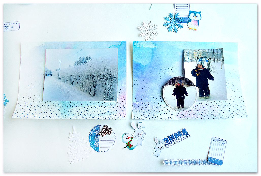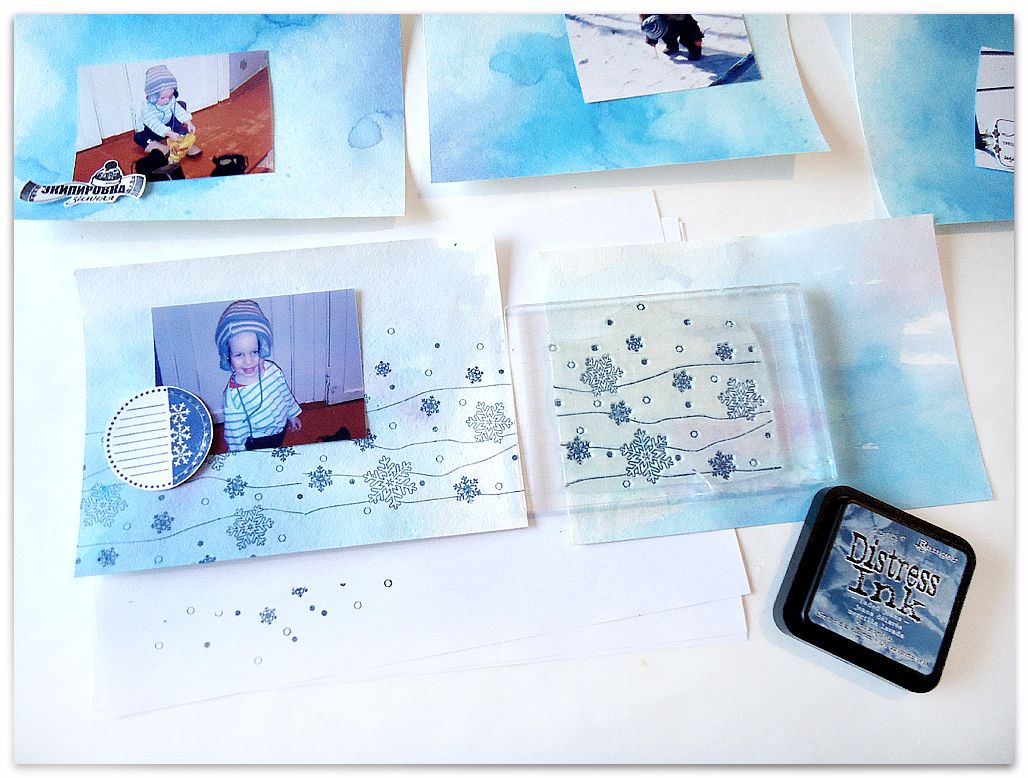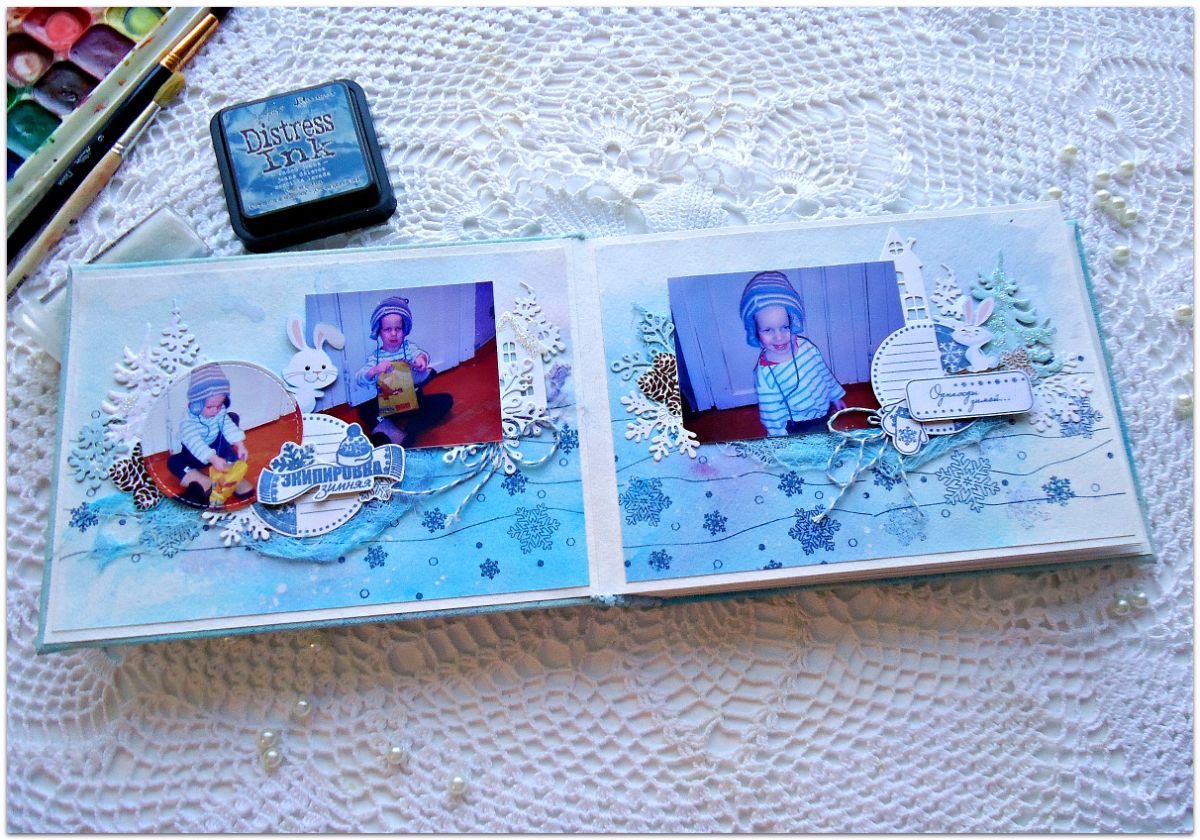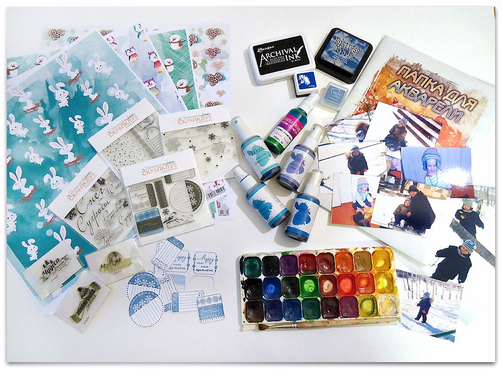 Тема альбома - зима, будем оформлять фото малыша и его первые прогулки. Альбом задуман достаточно простым, без скрапбумаги, кучи подложек и обильного декора. Основными моими помощниками станут акварель и штампы.
