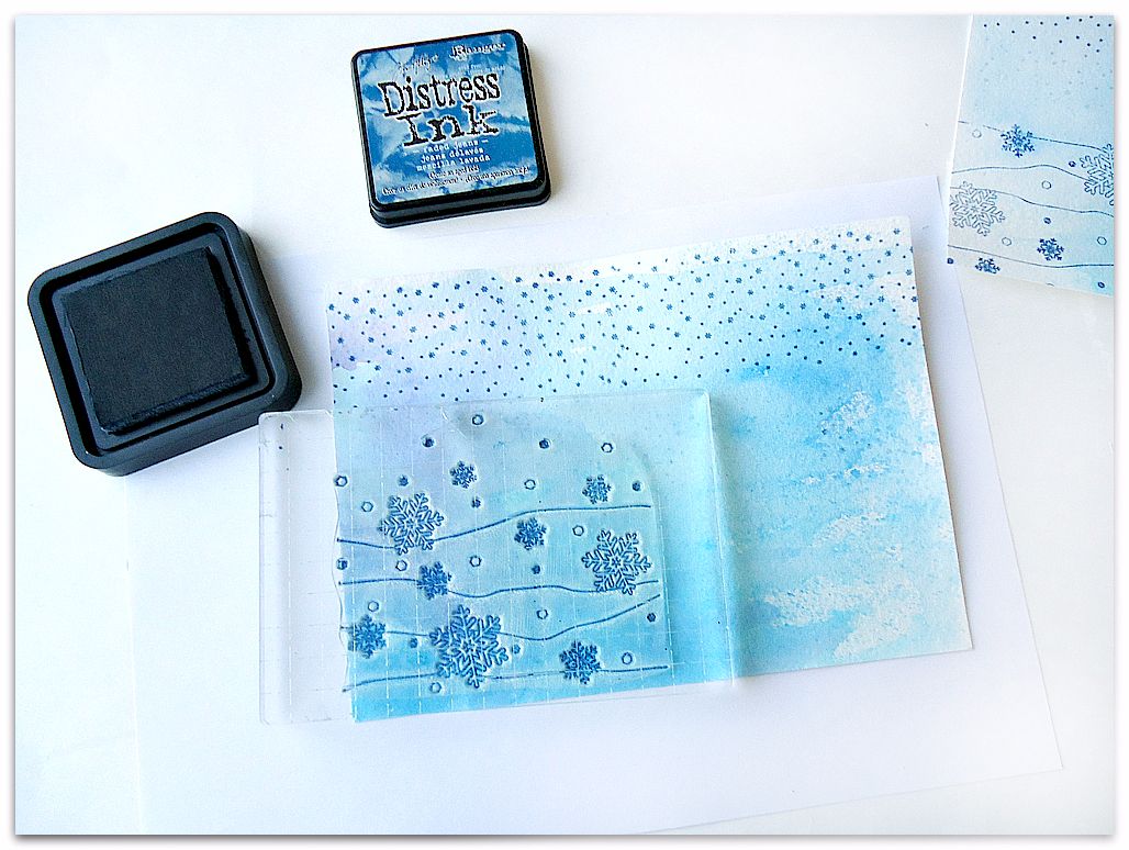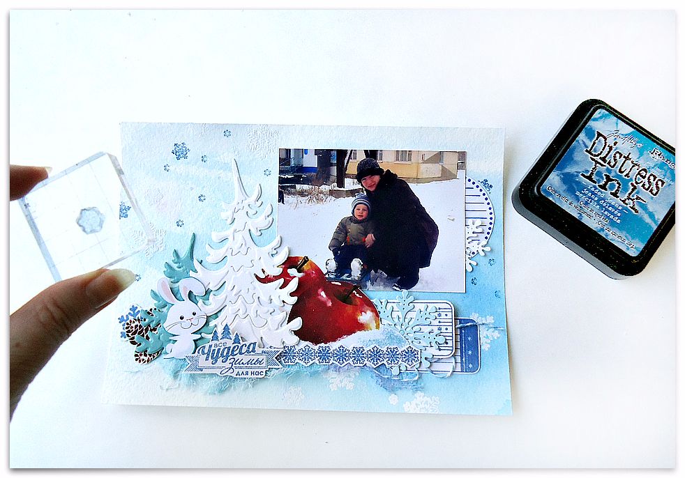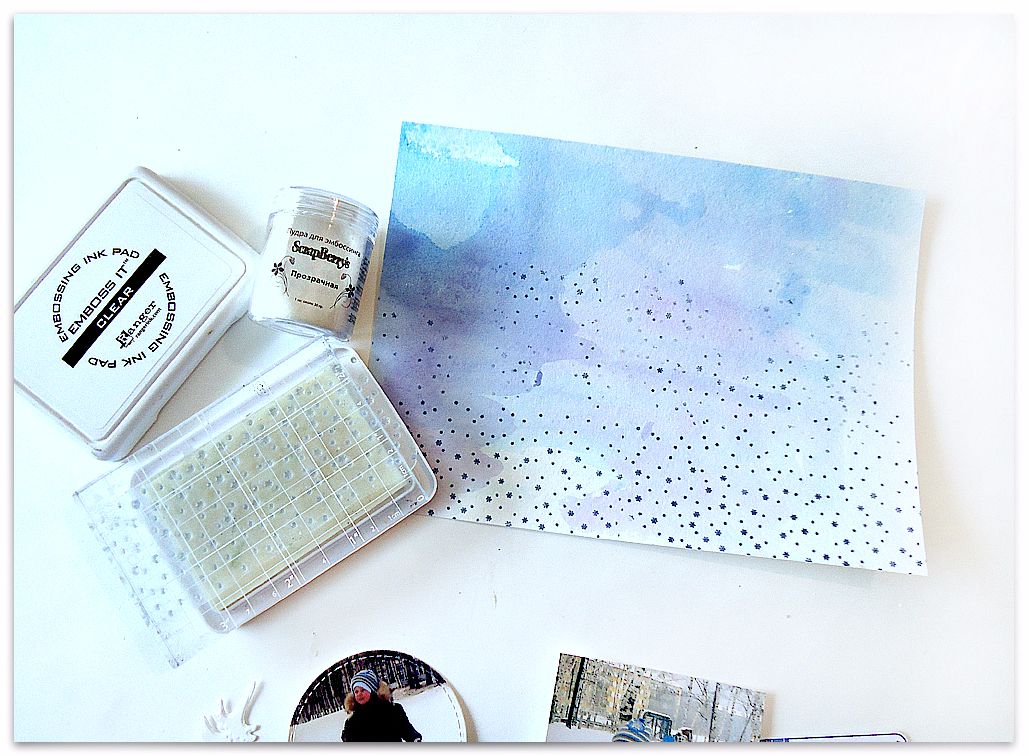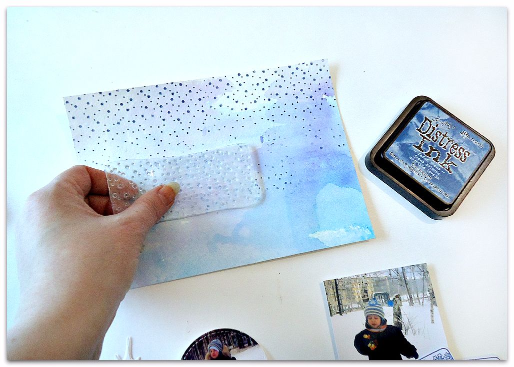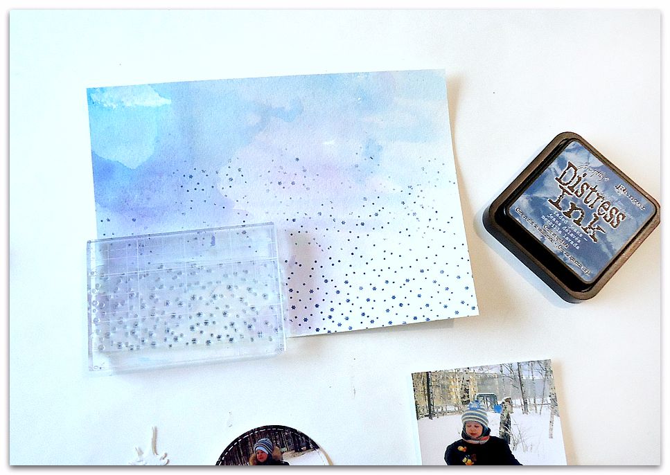 затем снимаем штамп с акрилового блока и уже мягким штампом ставим нечеткие оттиски в средней части странички, создавая эффект идущего снега