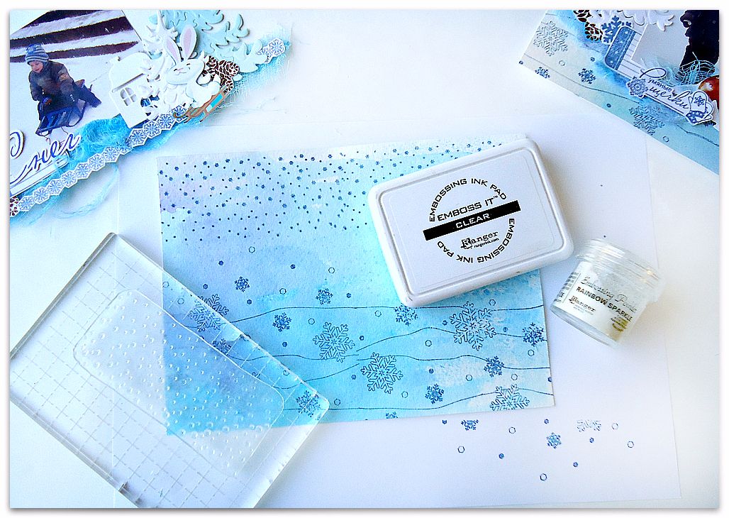 В этом развороте для создания фона я взяла отдельные штампы Снежинки и скомбинировала простые оттиски чернилами с оттисками горячим эмбоссингом.