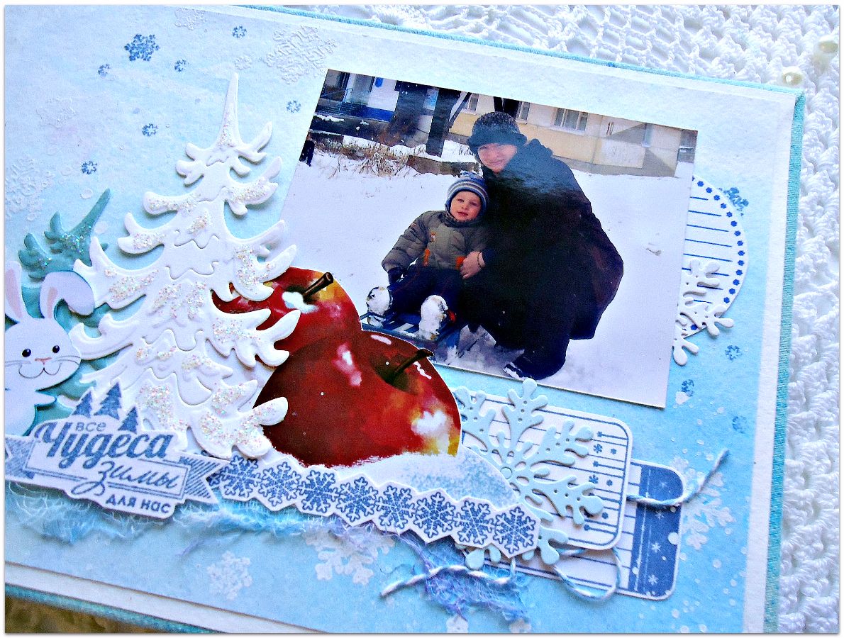 Также поступаем и со второй половиной разворота - располагем декор вокруг группы фотографий, объединяя их. Елочки, как основной элемент зимней прогулки, становятся фоном и прячутся под фотографии, журналинг зимний вертикальный становится обыкновенным тегом и также прячется за фото, как вариант можно его заполнить и сделать вынимающимся )) Карточка с надписью "Зимняя история", снегирь на ветке, рукавички, бордюр из снежинок - все поддерживает сюжетную историю прогулки.