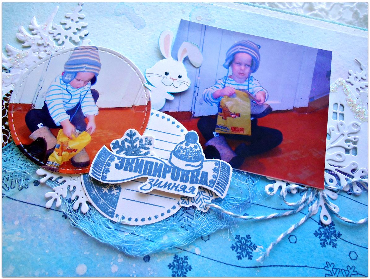 поэтому при оформлении странички мы постараемся закрыть это место декором, добавляя круглый элемент для журналинга и надпись "Зимняя экипировка"