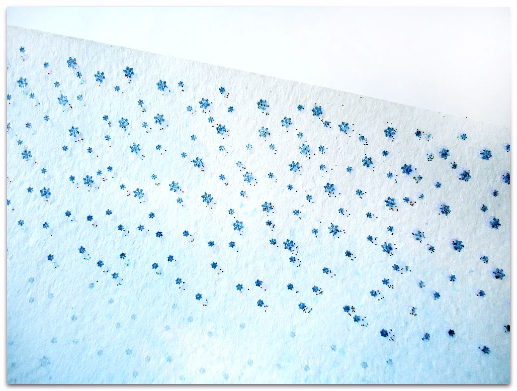 А теперь вспомним как снег тает на наших лицах, ладонях, одежде... Воспроизвести эти маленькие капельки поможет горячий эмбоссинг прозрачной пудрой, а сверкающее мерцание даст горячий эмбоссинг пудрой с радужным глиттером.