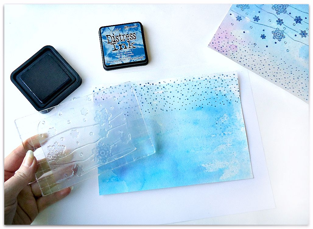 Еще один вариант для фона - комбинируем горячий эмбоссинг и штампинг. Для этого понадобится штамп Снежинка, им мы сначала сделаем крупные хаотичные оттиски и запечем с белой пудрой, а затем более мелкими снежинками с дистресс чернилами добавим естественности и активности.