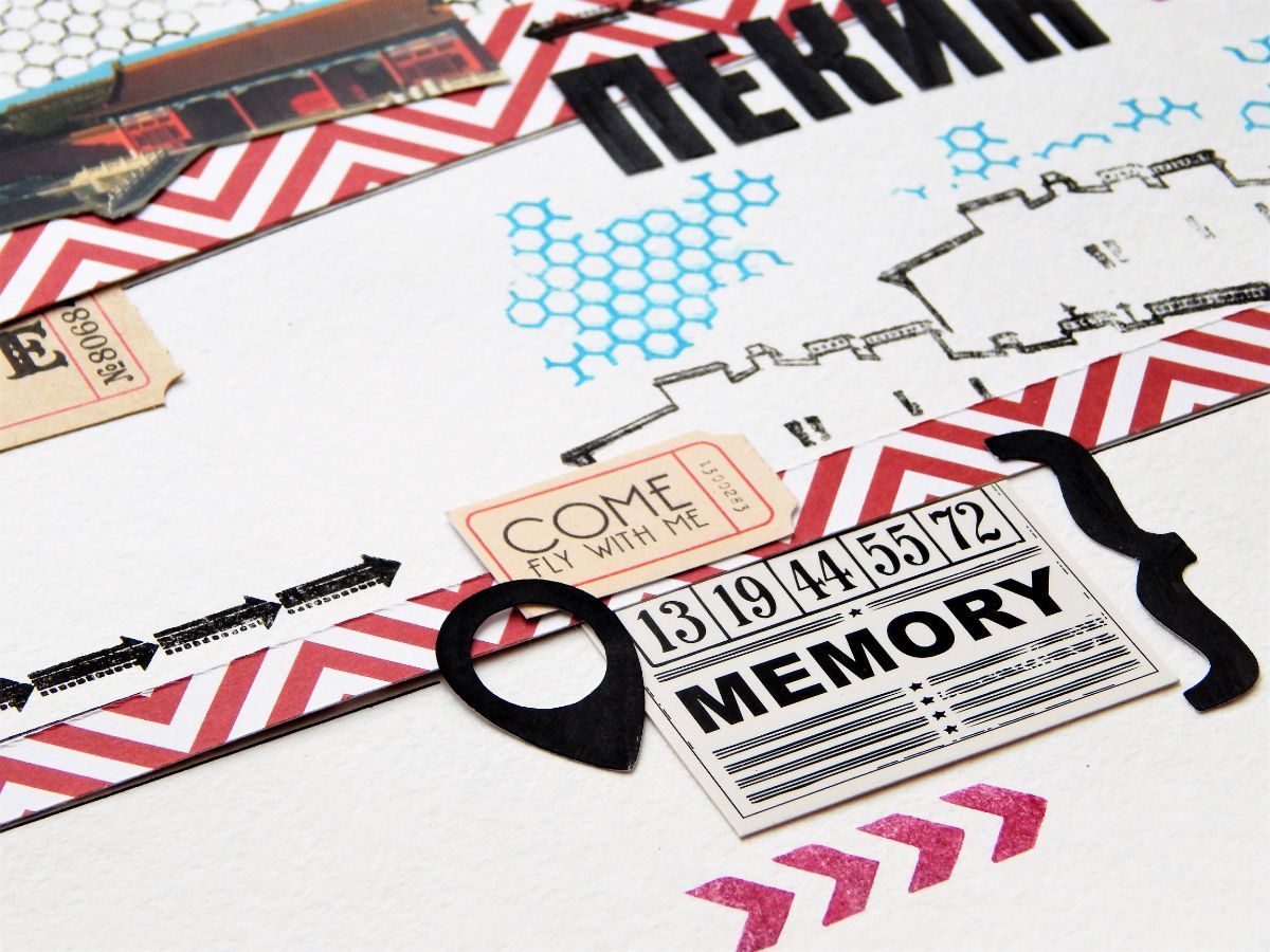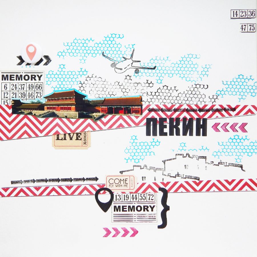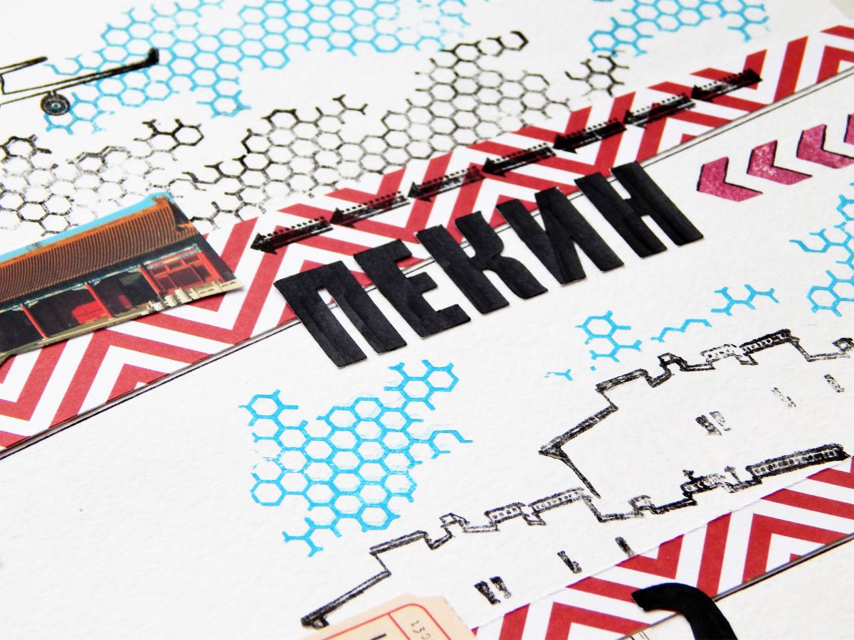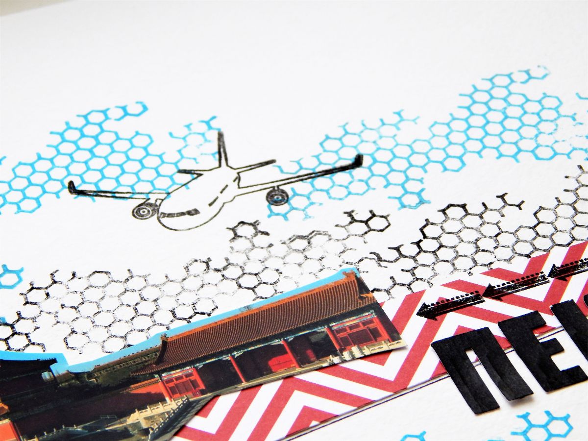 Штампом "Микс 4" я постаралась изобразить горы и небо Пекина. и в небе у меня летит, очень сюда подходящий, штамп "Самолет"