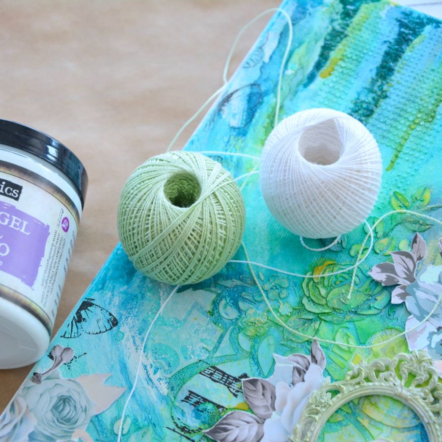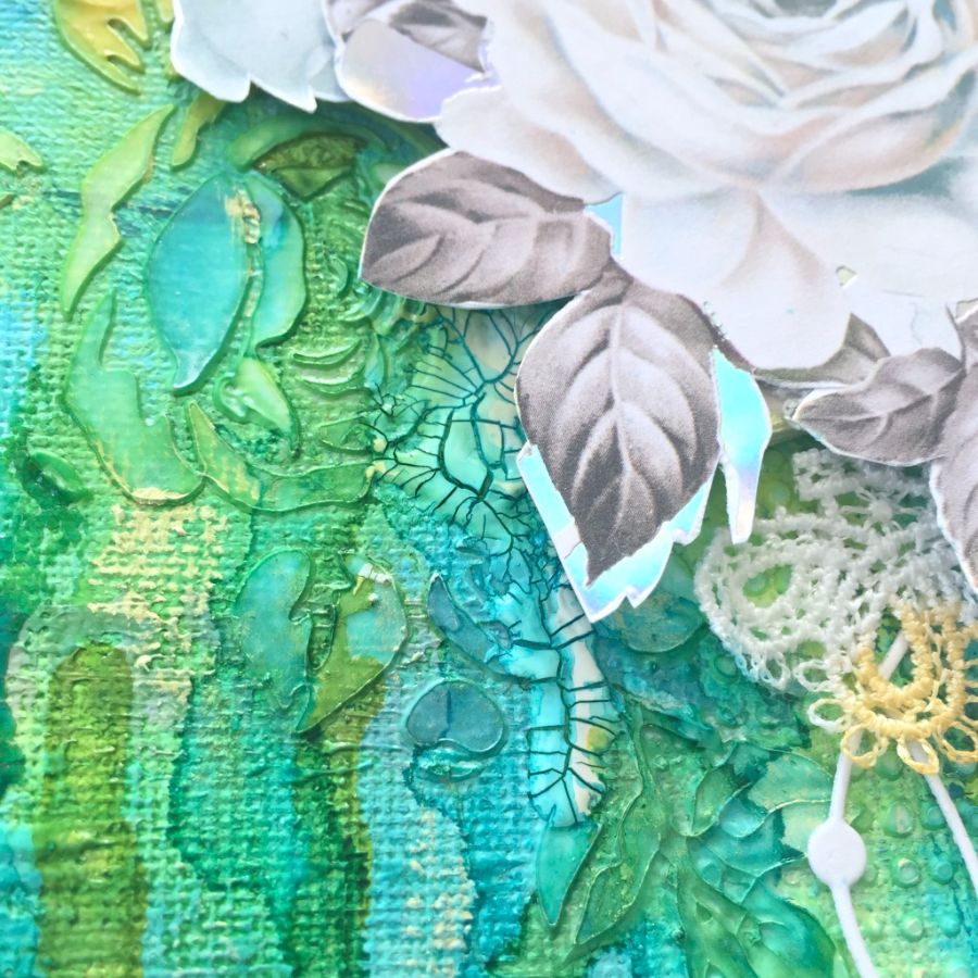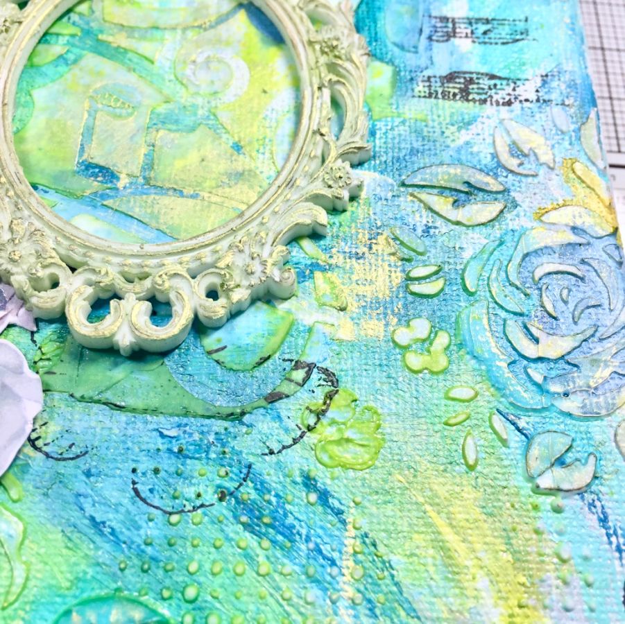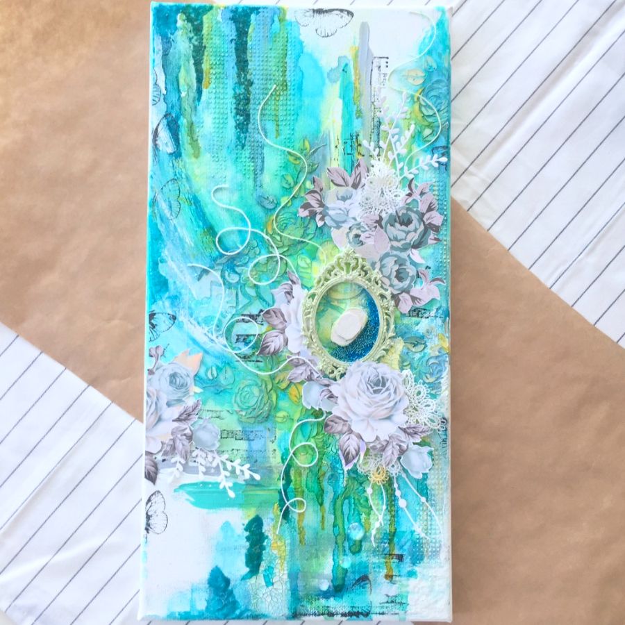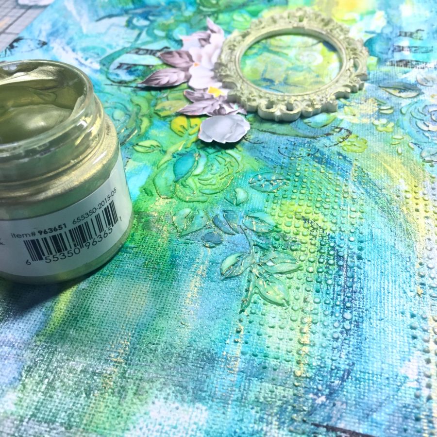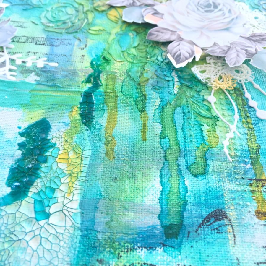 Пока примеряла и красила рамку, добавила на холст немного кракелюрной краски и геля. Слой не был толстым, поэтому красивые трещинки появились достаточно быстро.