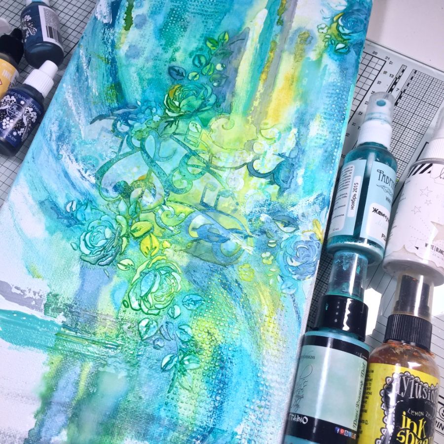 Свои разводы и подтеки я сделала при помощи спреев и алкогольных чернил. На этом этапе у меня появился желтый цвет и глубокий синий. Снова набираем воздух в легкие, выдыхаем ОМ и ждЁМ)) А чтобы ждать высыхания очередного слоя было интереснее, займемся иготовлением центрального элемента композиции.