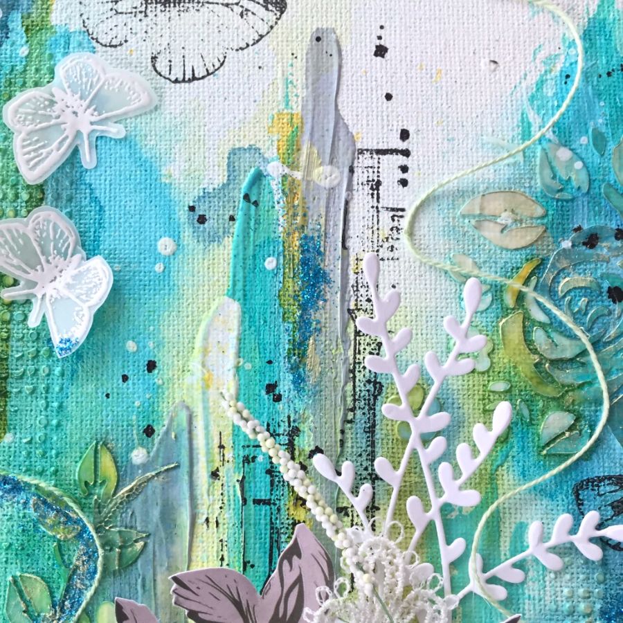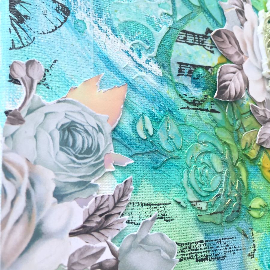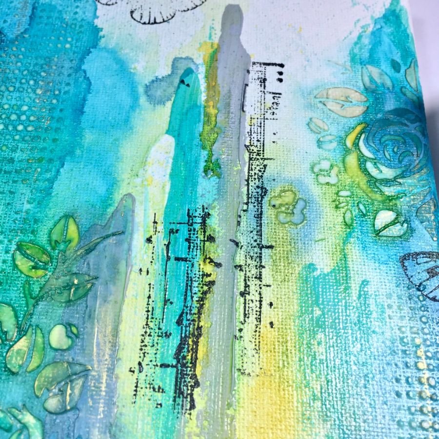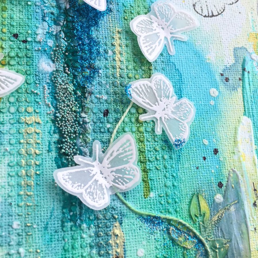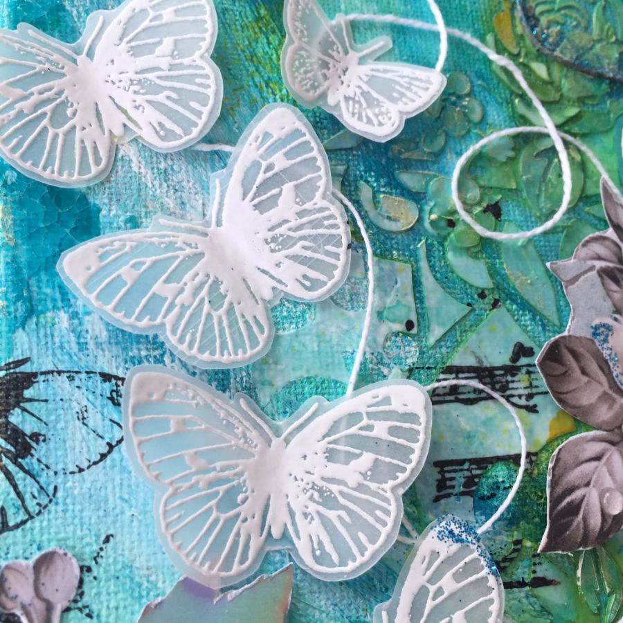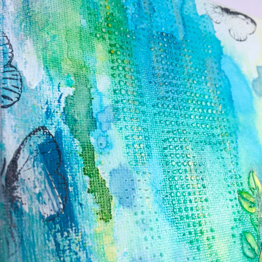 Пока я занималась бабочками, штамповала и вырезала их, мой холст подсох и пришло время поработать с трафаретами. Я использовала три варианта: точечный, музыкальный и с цветочным принтом.