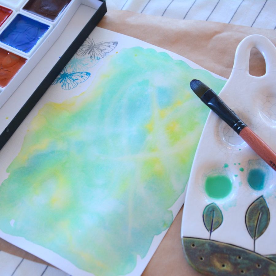 Мне понадобится много бабочек)) Много-много воздушных трепетных бабочек! Для этого я создаю их оттиски на белой полупрозрачной кальке, посыпаю пудрой для эмбоссинга и запекаю. Но на всякий случай я хочу сделать еще одну легкокрылую стайку, но на этот раз при помощи черных и синих чернил на акварельной бумаге, раскрашенной акварельными же красками той же цветовой гаммы, что и будущая композиция.