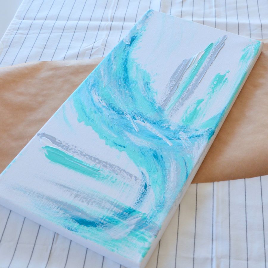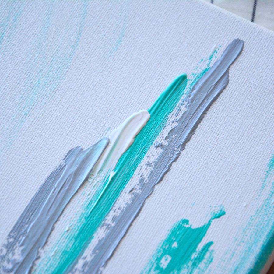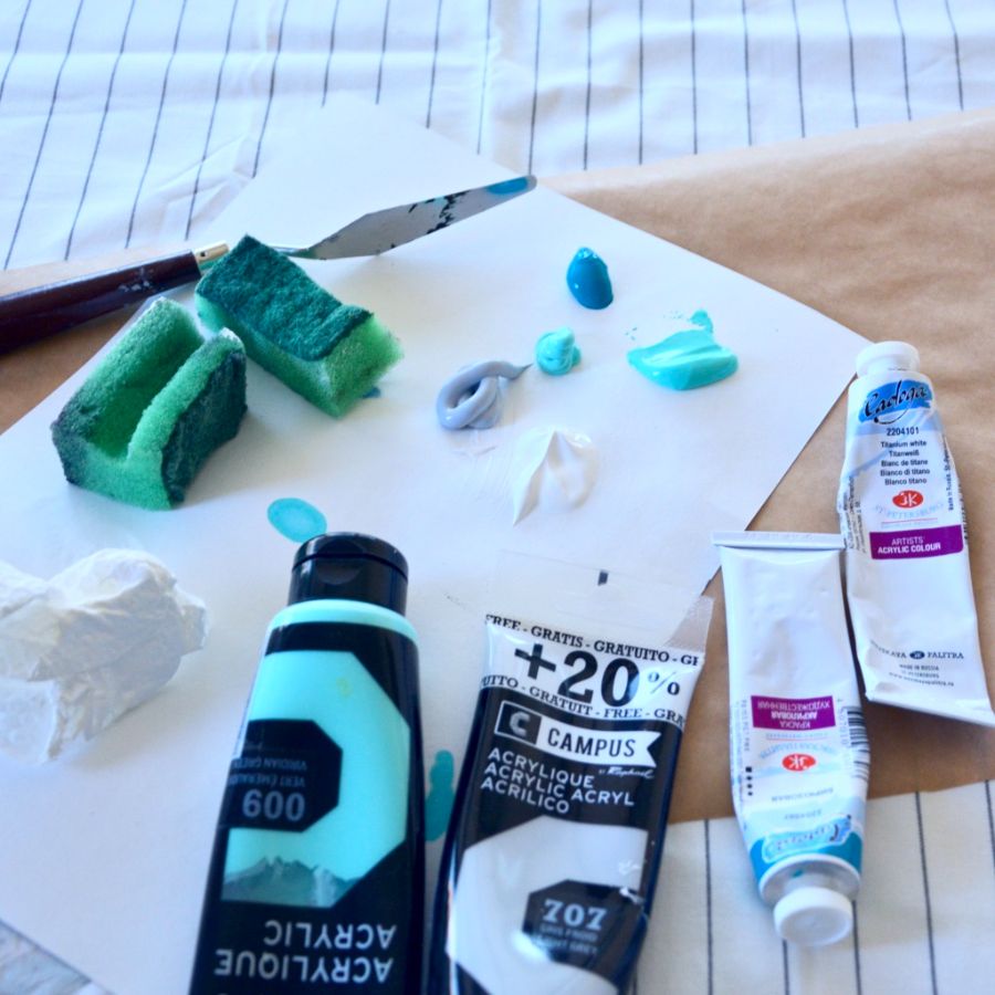 Моя весна решила быть бирюзово-серо-бело-мятной)) с небольшими вкраплениями синего и желтого, но о них чуть позже. Краску я буду наносить на холст широкими мазками, и для этого мне понадобится мастихин. Буду втирать ее в холст и перемешить между собой при помощи губок и бумаги, которые обеспечат мягкие переходы.