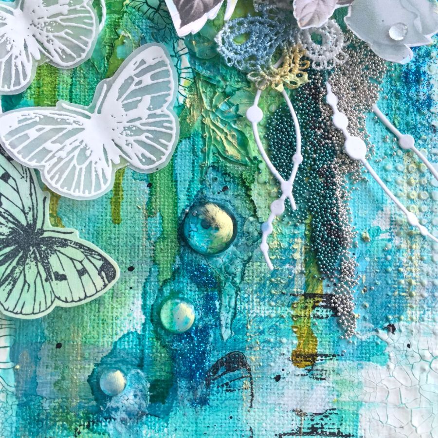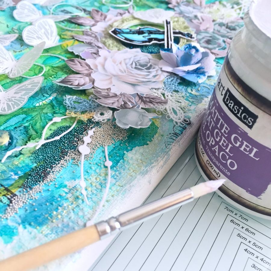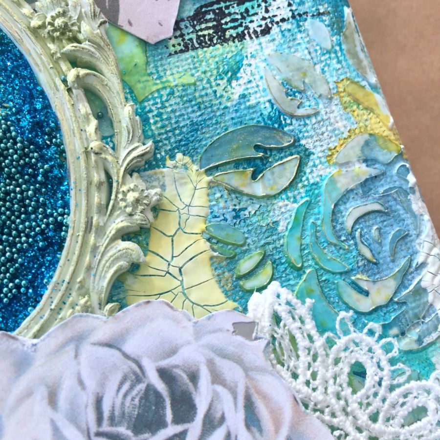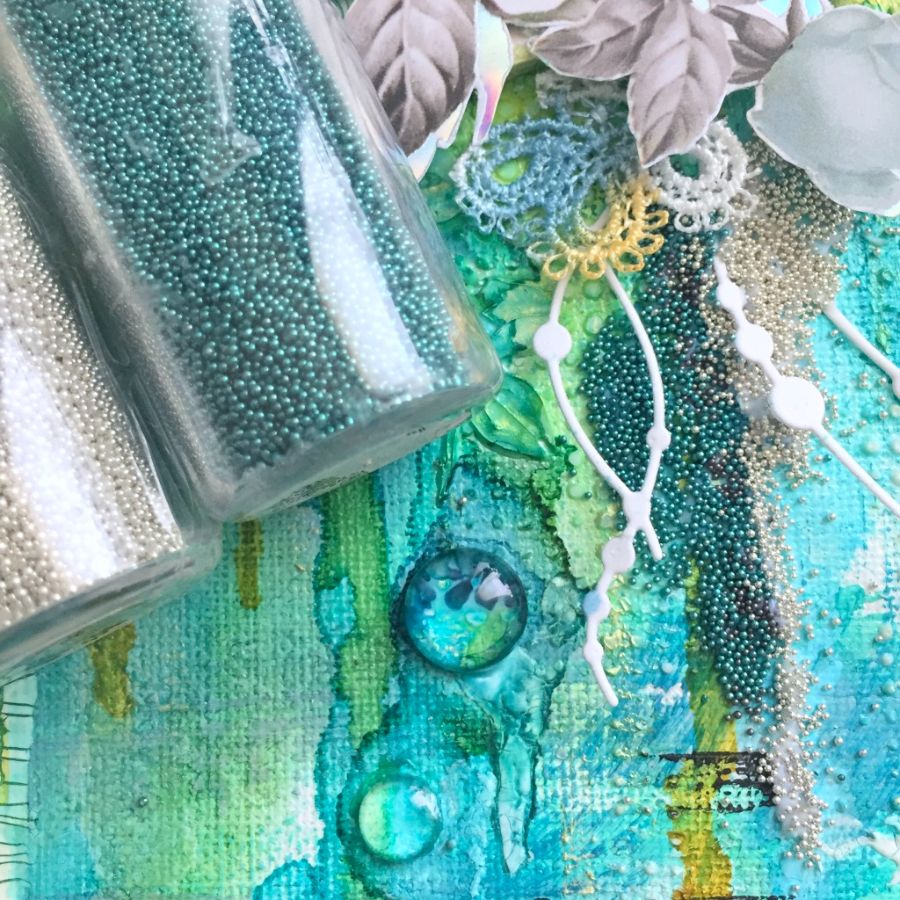 Местами еще добавляю микробисера, а также кабашоны, которые всегда хорошо смотрятся в миксмедийных работах. И тот, и другой декор сажаю на уже выше упомянутый гель, который при высыхании становится прозрачным.