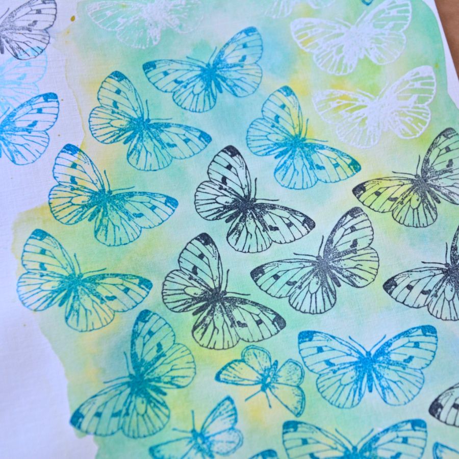 Я смешала на бумаге краски, добавив немного желтого, подсушила и затем поверх нанесла оттиски бабочек. Даже, если для моей работы мне понадобится не вся стайка, они не осядут в "коробке идей" (то есть в долгом ящике))) а найдут свое применение в открытках, которые так приятно дарить весной.