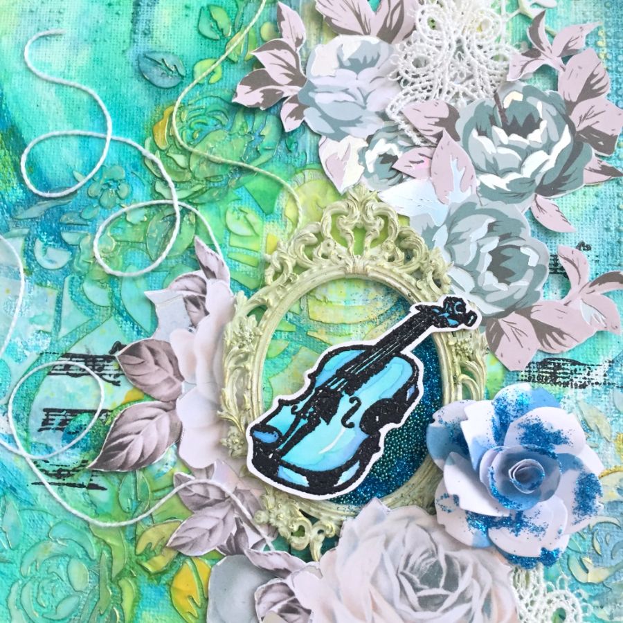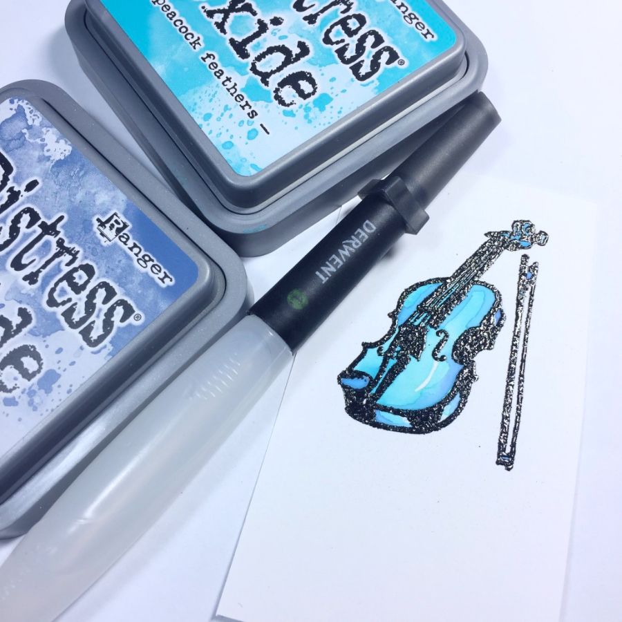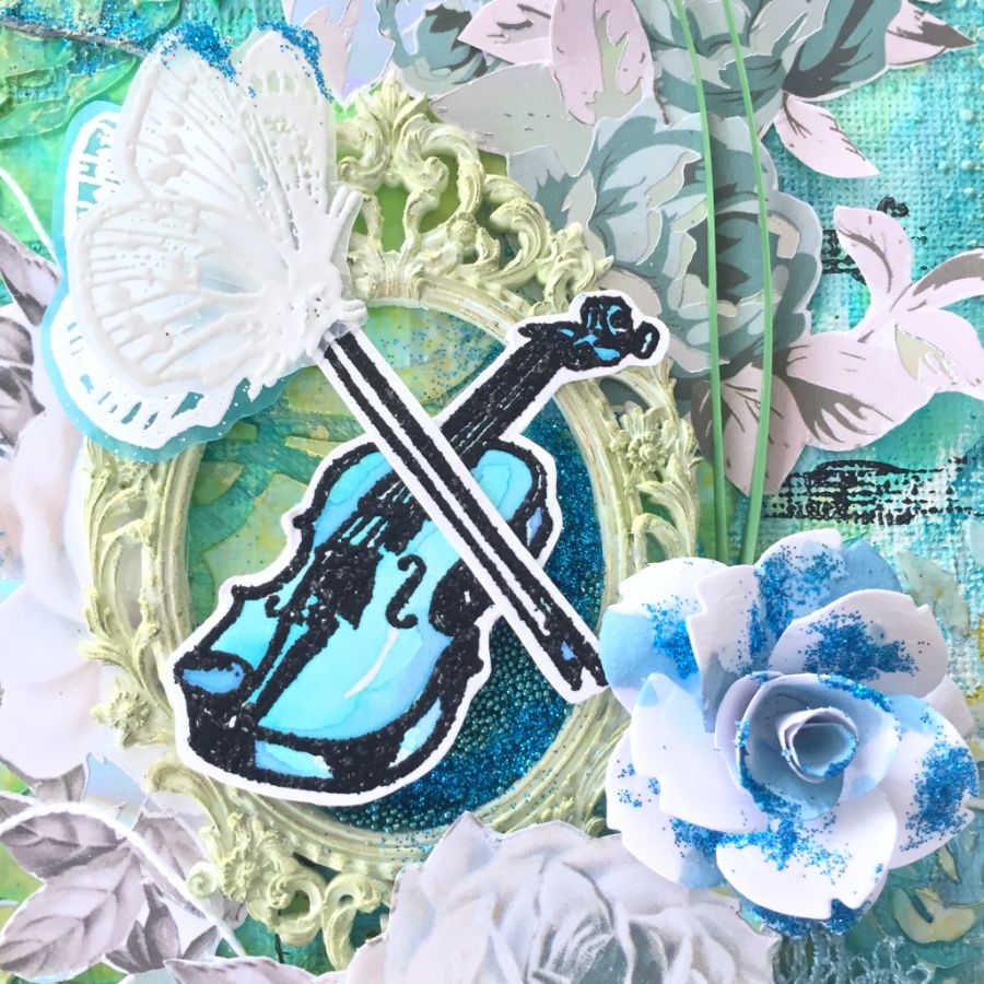 Это старый романтик - скрипка со смычком. Минорно-мажорный слёзоизвлекатель и мастер прикосновений к человеческой душе. Сам оттиск выполнен при помощи горячего эмбоссинга. Черная пудра с глиттером пришлась как нельзя кстати. А необычный цвет скрипке придали дистресс-чернила.