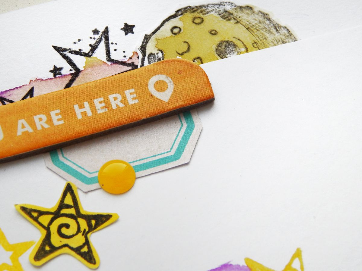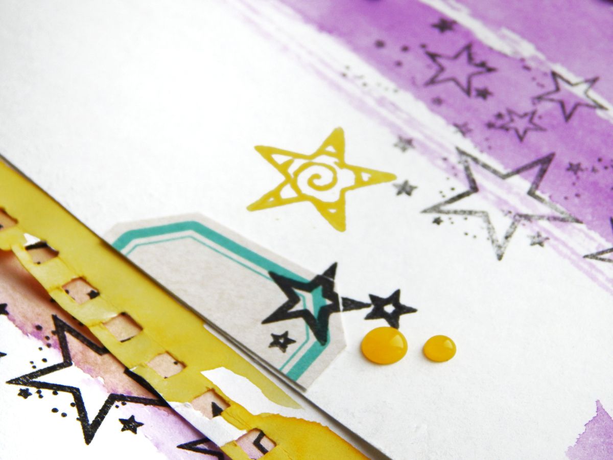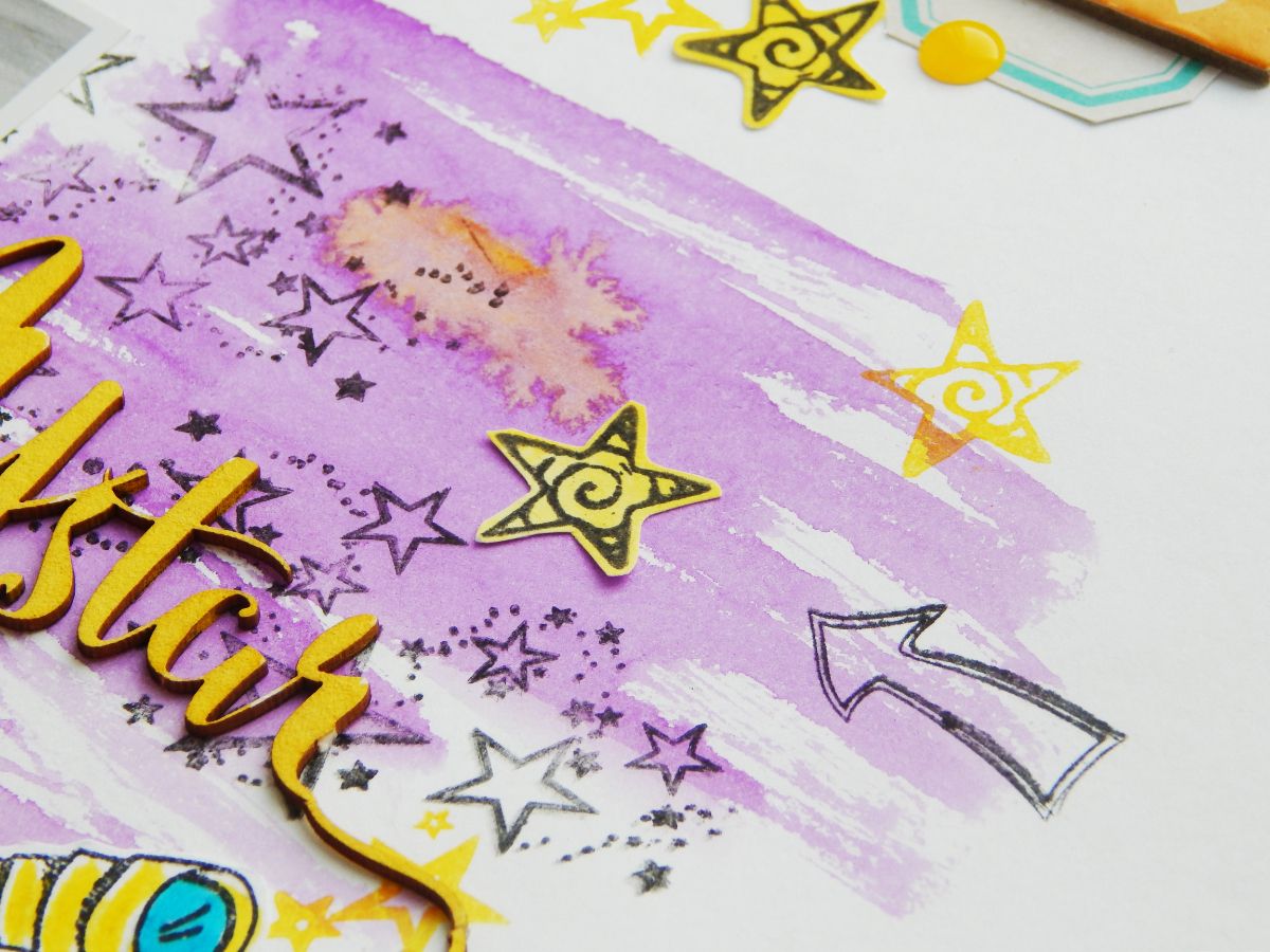 Для создания звездного неба я использовала для основы акварельную краску и классные штампы звезд "Звездное Небо" , "Звезда 7". Некоторые звездочки я сделала на отдельном, покрашенном в желтый, листе и вырезала их "Звезда 6"