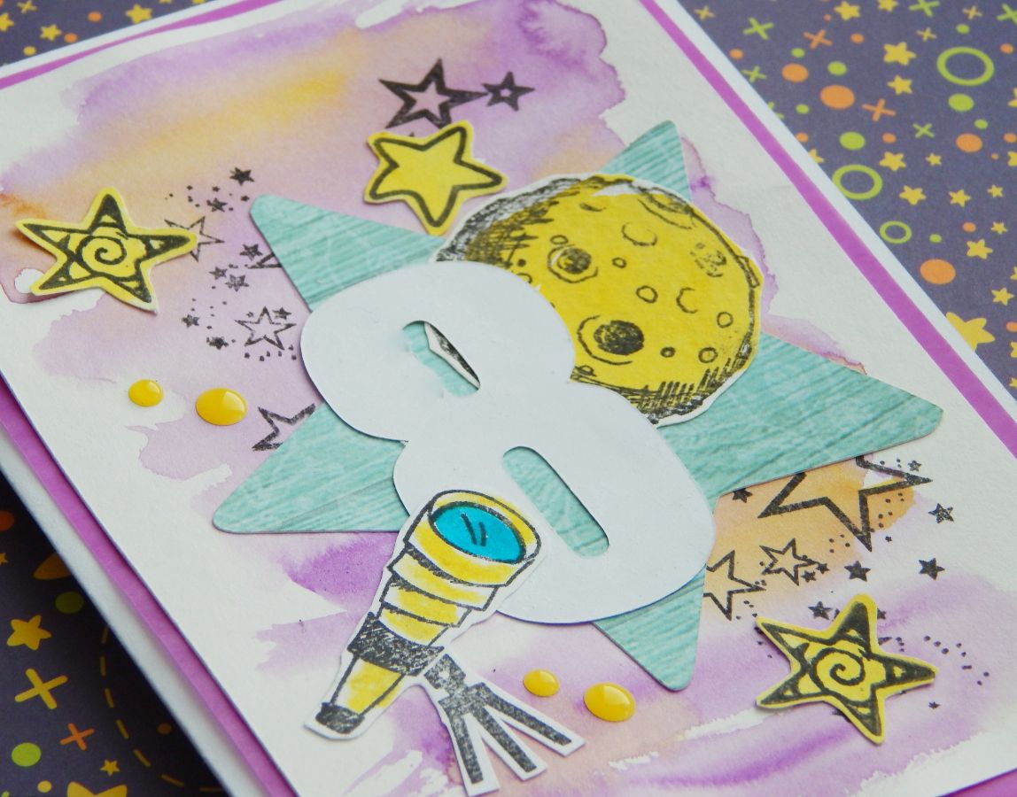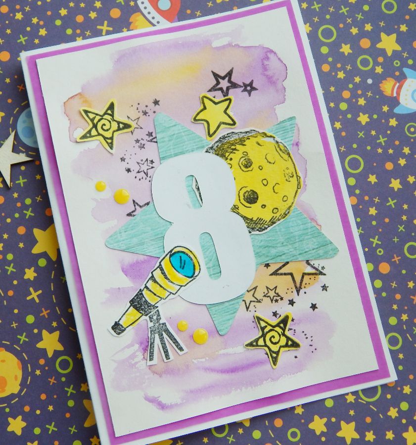 И, по традиции, на день рождения сына я делаю ему открытку, в этом году у меня получилась вот такая. Кстати, первый раз у нас была задета тема космоса.