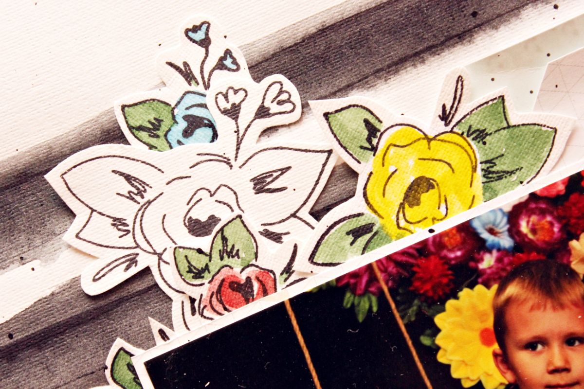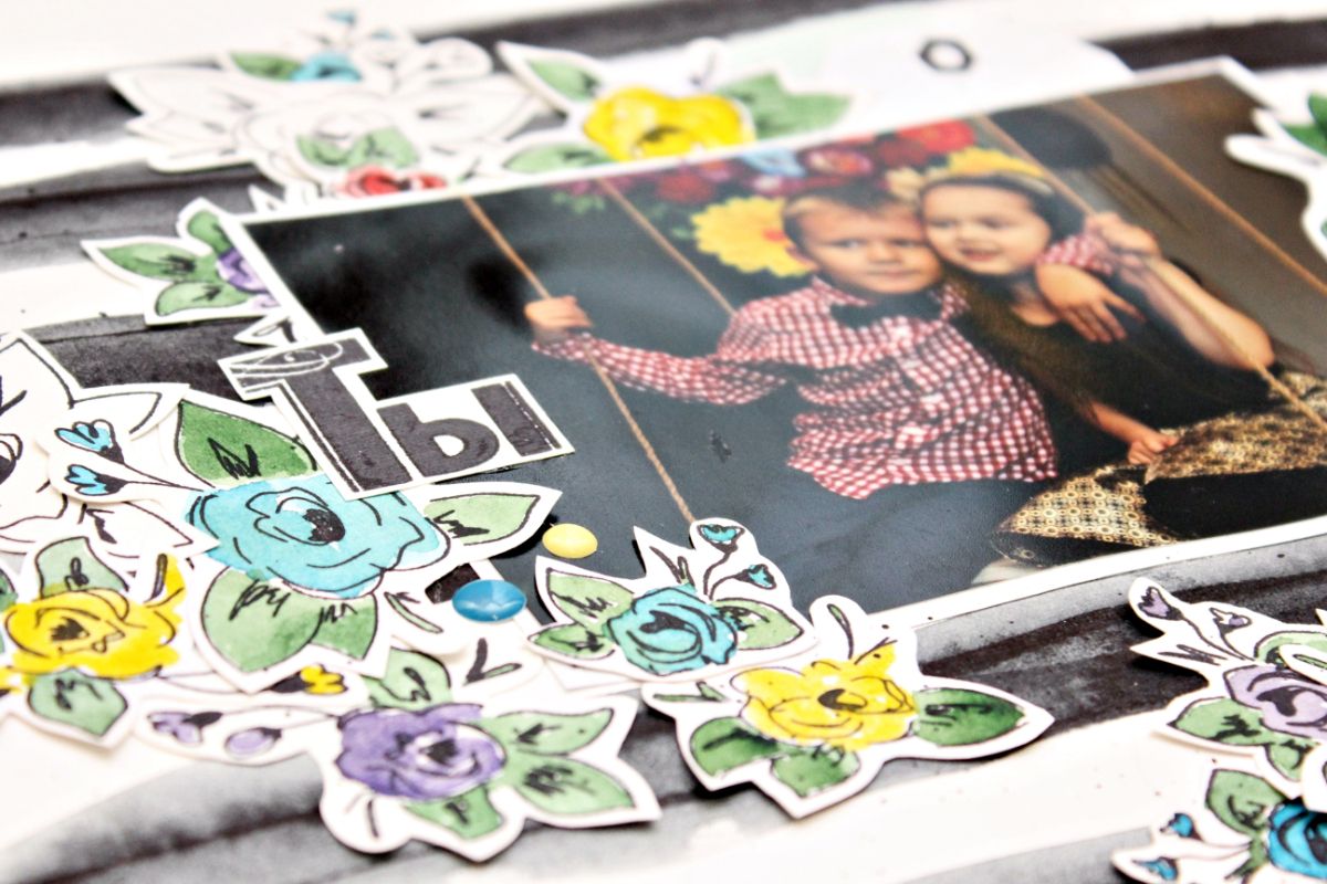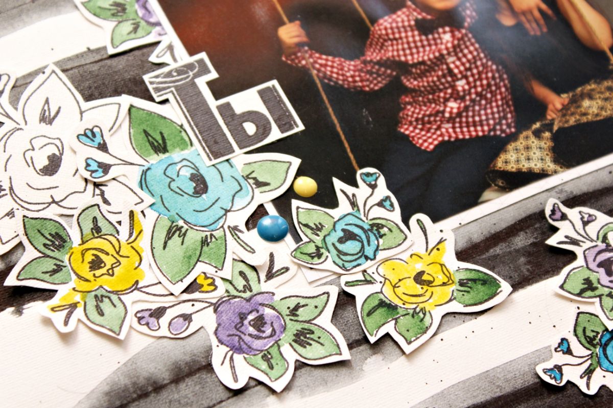 Штамп "Я" находится рядом с дочкой и тоже выглядывает из цветов. Так как палитра достаточно яркая, пропустить буковки сложно.