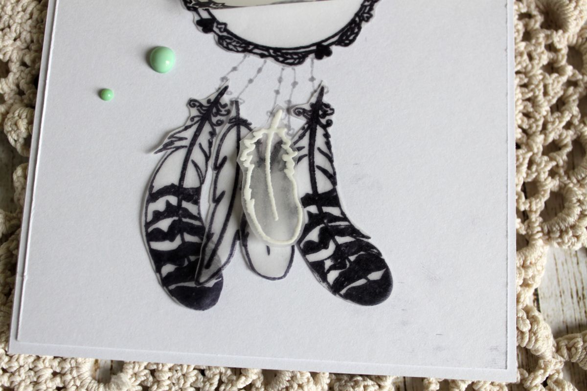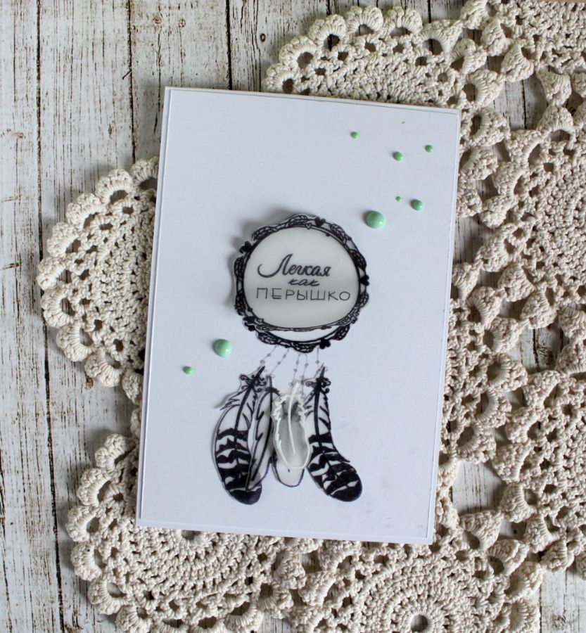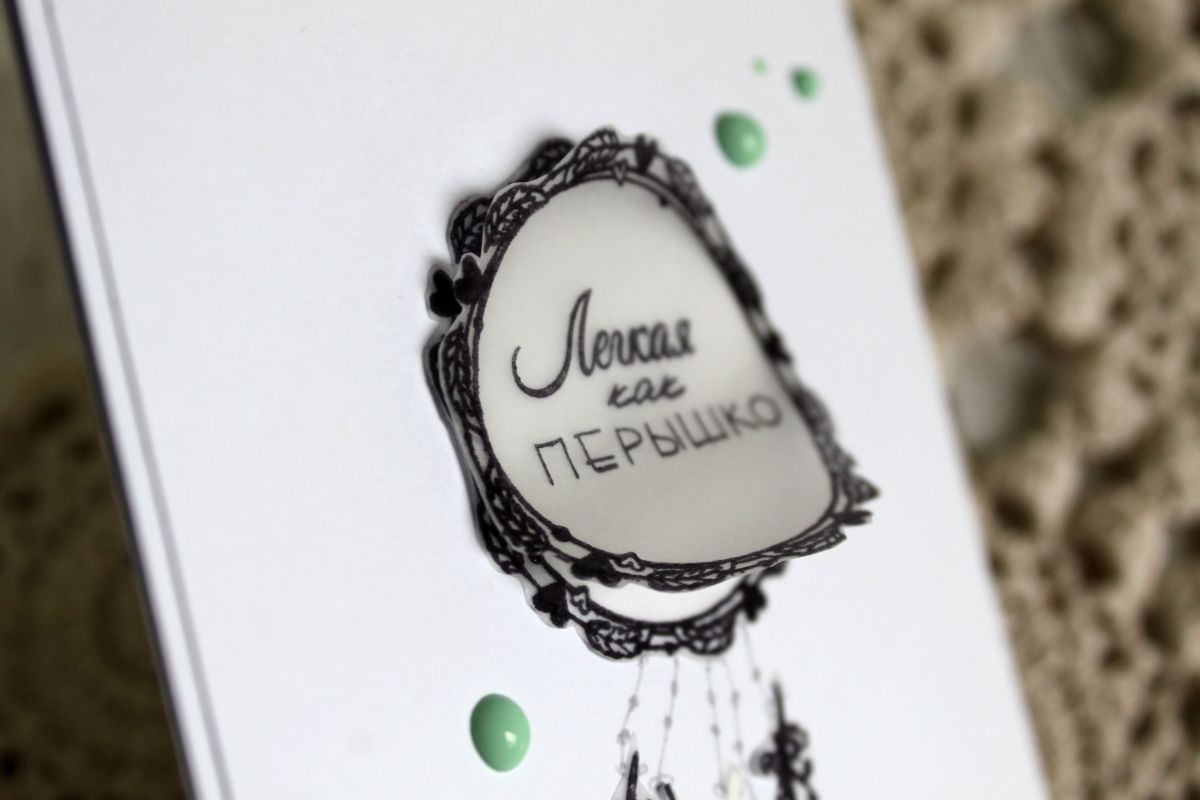 Тут таки опять калька))) Из за нее открыточка вышла невесомая. Я склеила две отштамповки между собой. Текст отштампован только на верхней, нижняя пустая. Добавила перьев, ниточки нарисовала лайнером. Дотсов для акцентов - и вуаля!