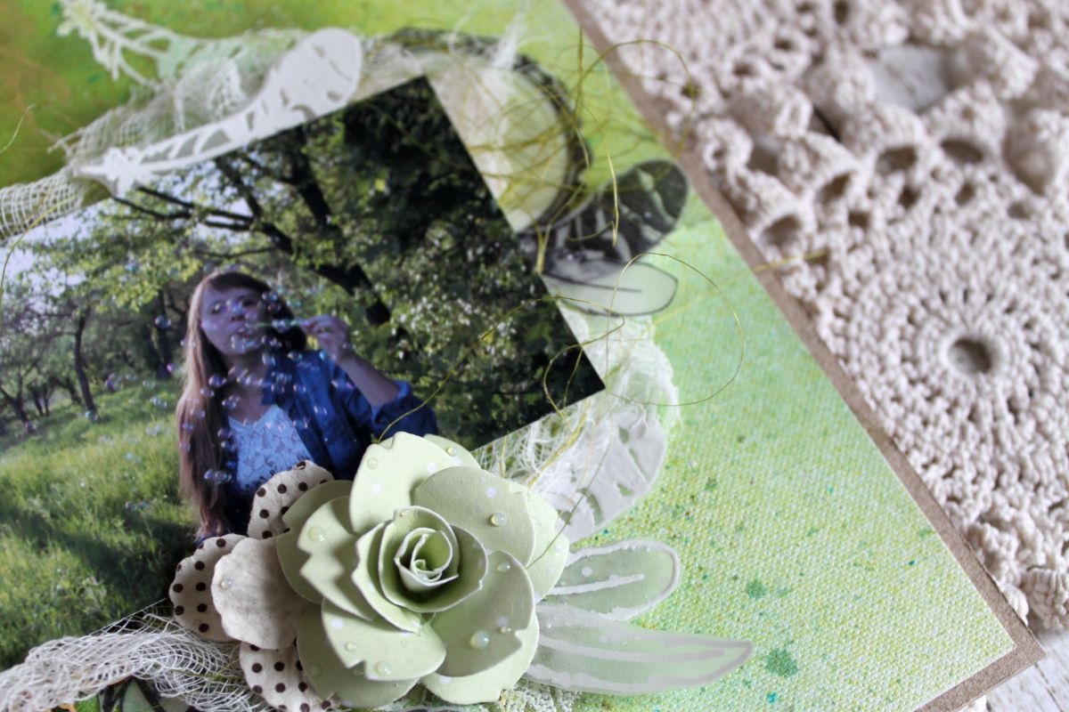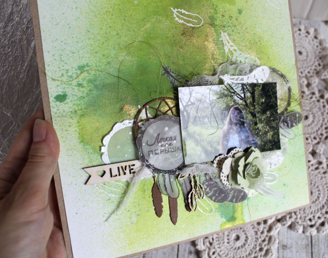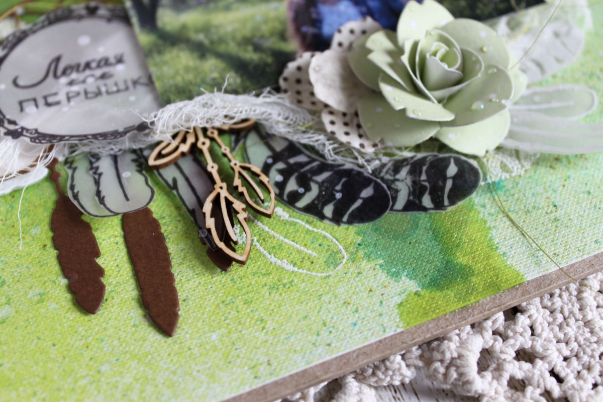 Моя фишка в этот раз - калька. Я отштамповала на ней архивными чернилами перышки и обруч (чернила необходимо закрепить феном, чтобы она осталась на месте, а не у вас на руках). И использовала эмбоссинг белой пудрой на фоне. Очень боялась, так как фон фактурный, но все прошло на ура!