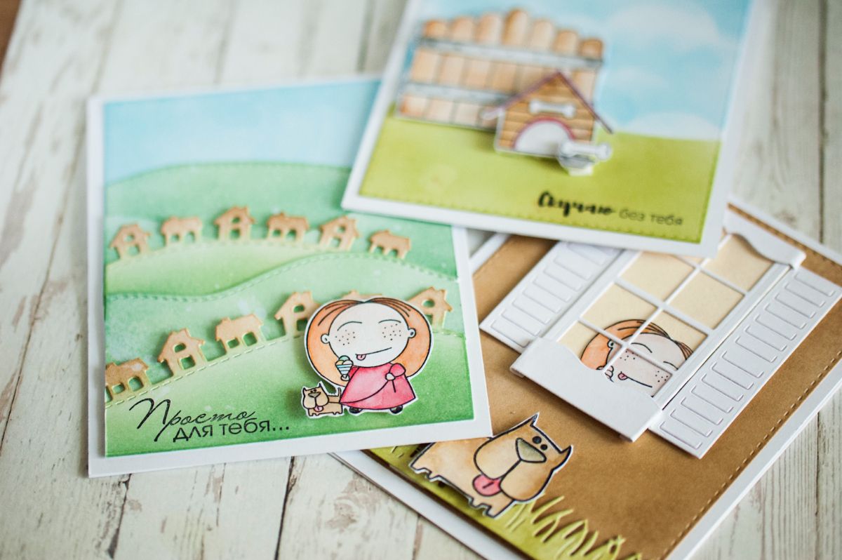 Для своих работ я использовала много ножей и любимые вдохновляющие штампы: "Заборчик" , "Будка", "Катюша гуляет", "Дружок", "Просто для тебя..." и "Скучаю без тебя"