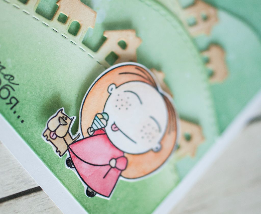 И первая открытка: Катюша гуляет на даче среди коттеджных домиков, наслаждается мороженым и играет со своим любимым псом.