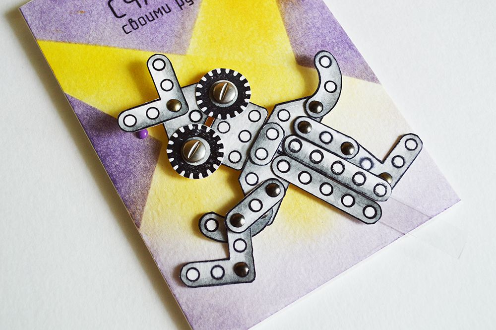 Ножки этого робота я скрепила между собой брадсами и нижние "пятки" скрепила с основой открытки, средние щупальца приклеила к прозрачному акрилу и если за него потянуть, то робот начнет смешно танцевать!