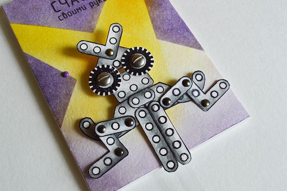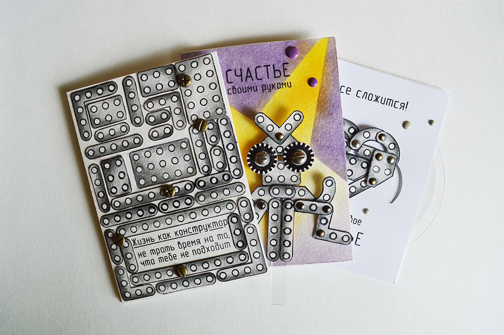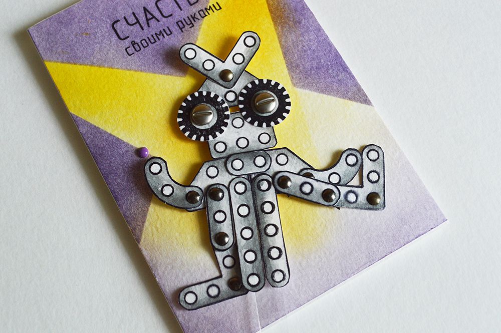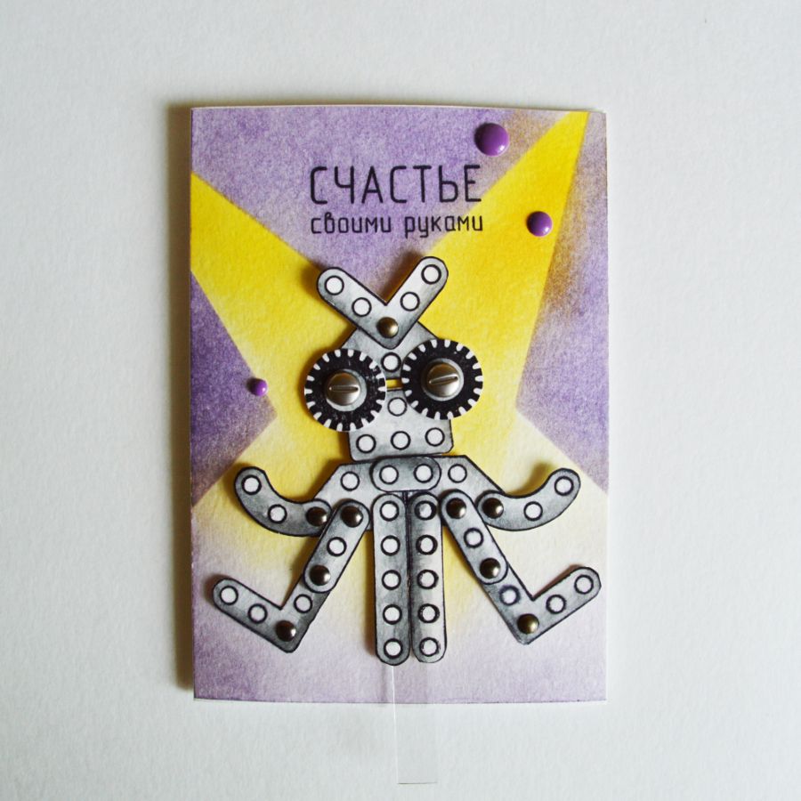 Я решила сразу сделать много заготовок и не ошиблась! В итоге у меня получилось три открытки. Первая веселая и задорная с двигающимся роботом - не то лягушкой, не то осьминогом. Кто это - решать вам))) А открытка мотивирует к тому, что все в наших руках. Хочешь быть счастливым - будь им, радуйся и веселись!