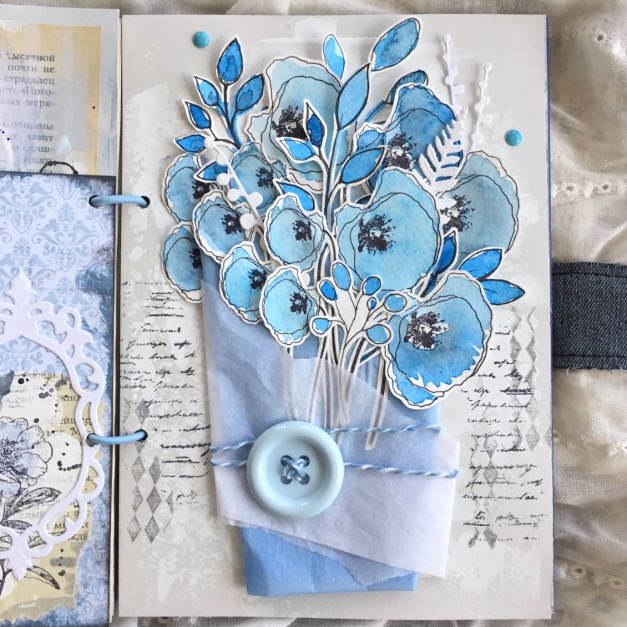 Разделители выполнены из трехсотграммовой бумаги светло-серого цвета, которую я, для создания нужного настроения, неоднородно покрывала белой акриловой краской и тонировала дистресс-чернилами синего и графитового цвета.