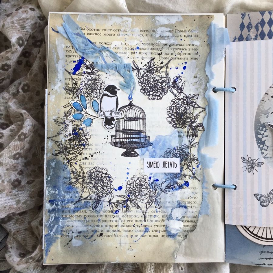 Стрекоза оказалась как бы внутри любовного послания. Обтекание текстом сделать просто. Нужно отпечатать объект на поверхности, затем сделать его оттиск на тонком листе бумаги, вырезать по конуру, закрыть им основной объект и сверху сделать оттиск штампа большего размера. А наивная веточка просто нарисована линером и раскрашена акварельными красками. Такие мы еще встретим на страницах нашего дневника.