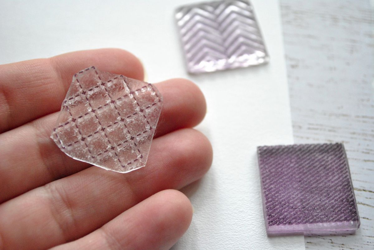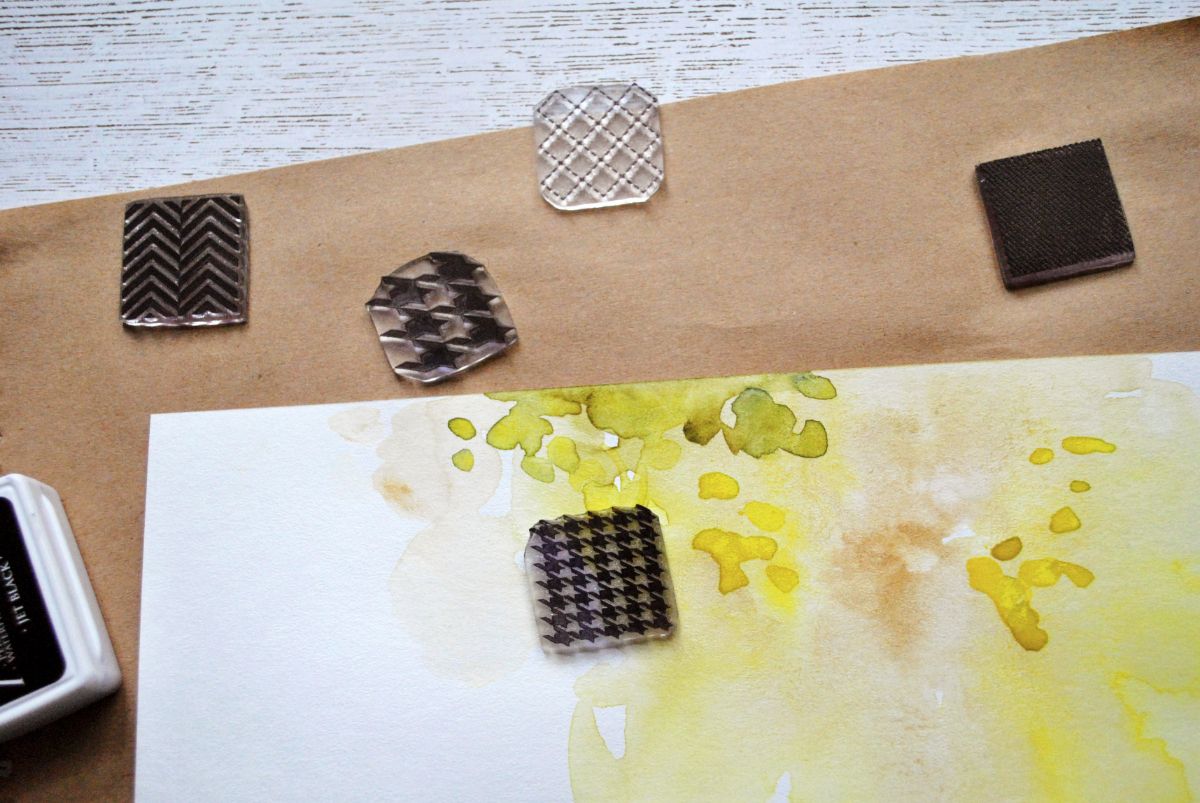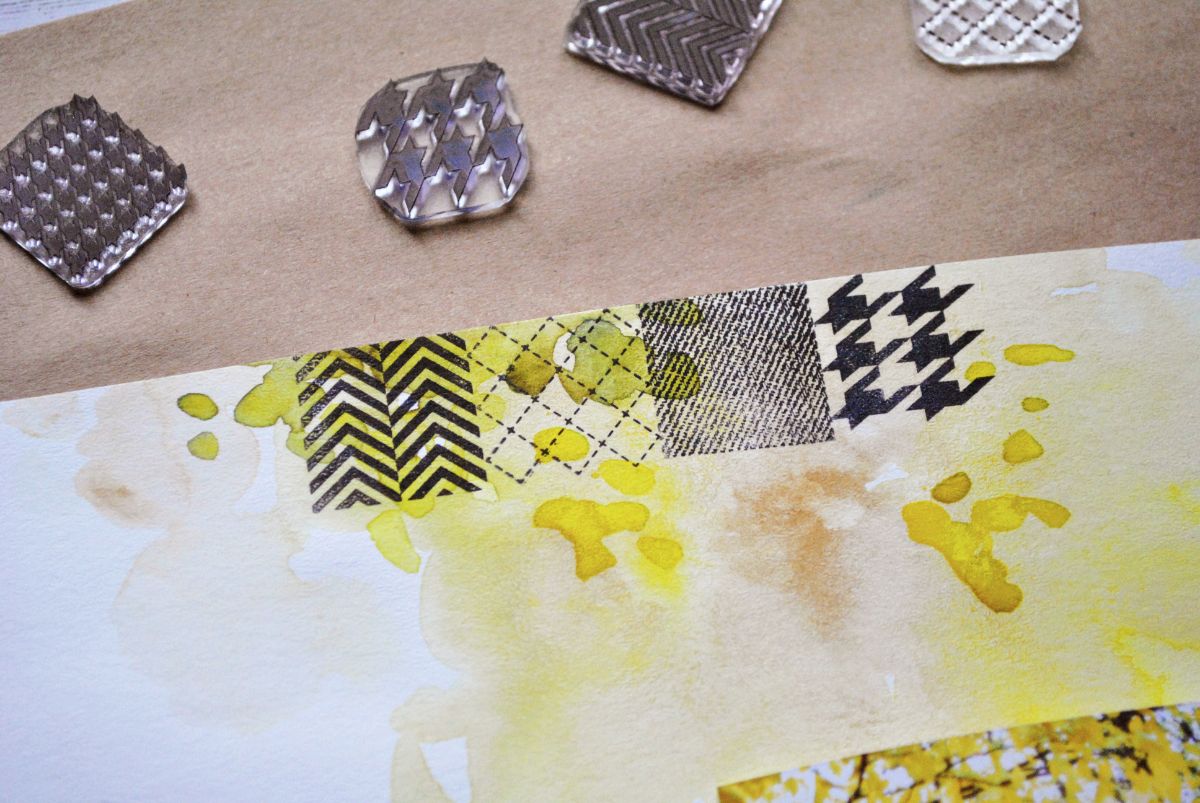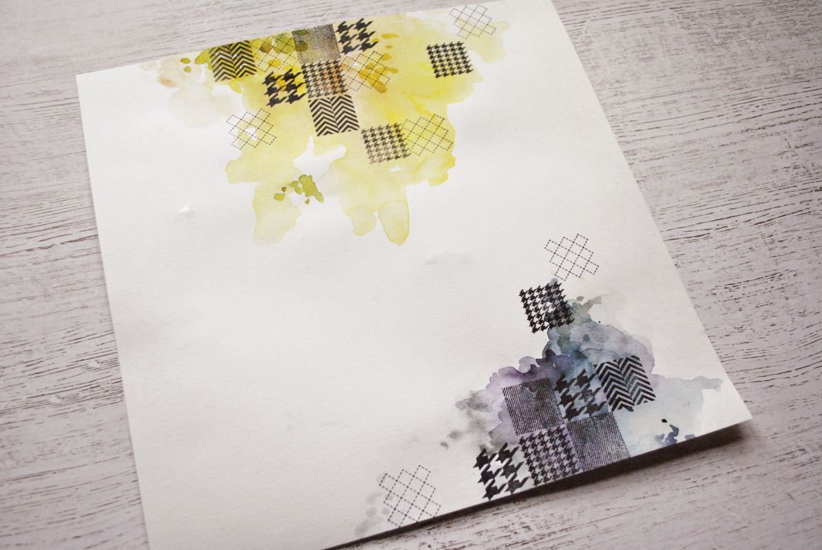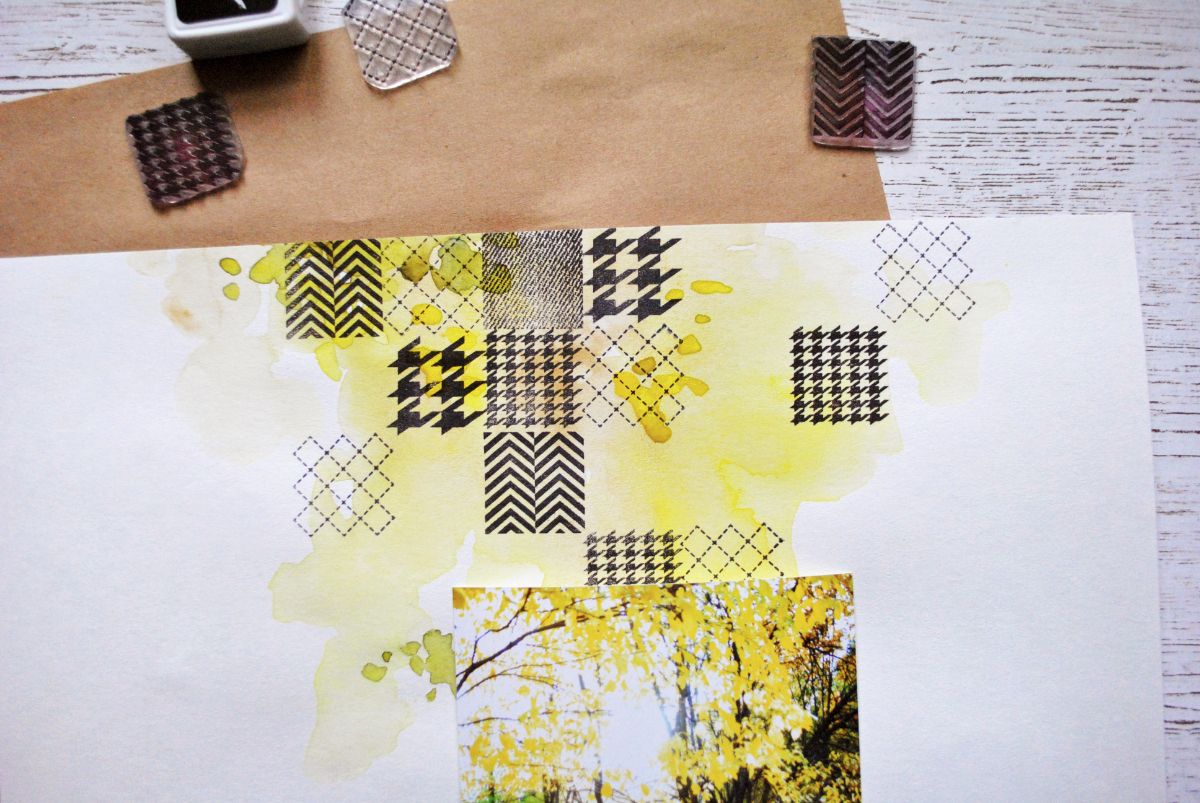 Жду, когда фон окончательно высохнет, и приступаю к созданию пэчворка. Я использую пять штампов-дюймов: Клеточка-строчка, Куриная лапка, Куриная лапка крупная, Шеврон двойной и Джинса.