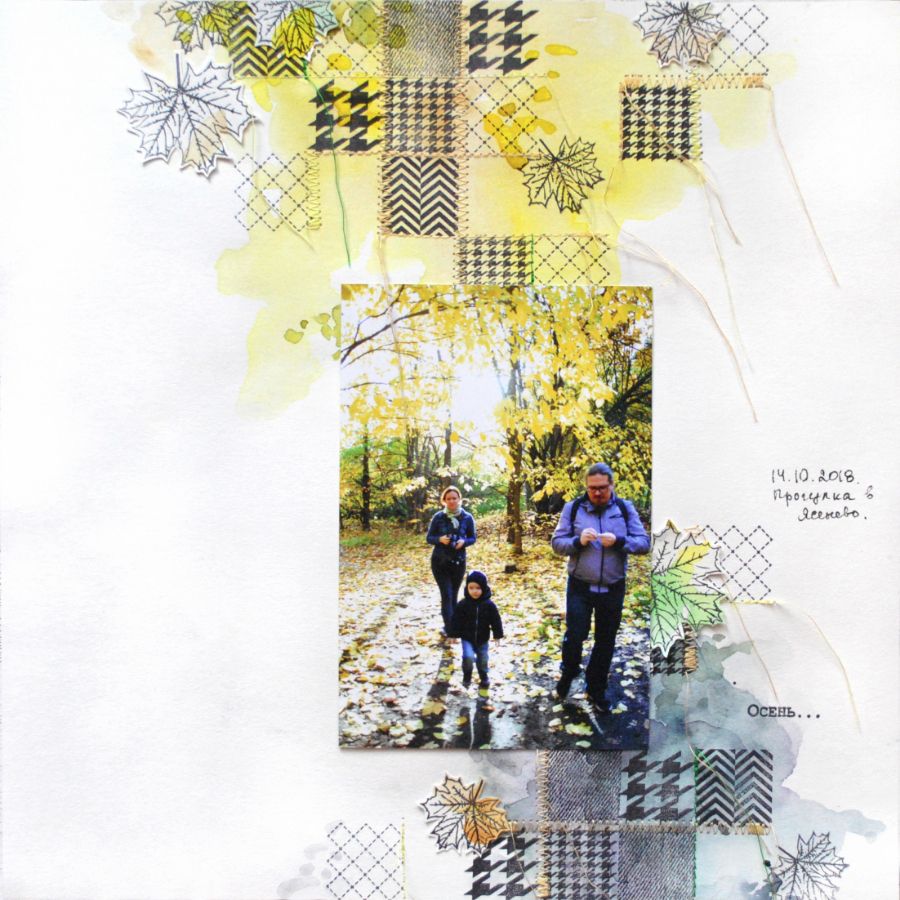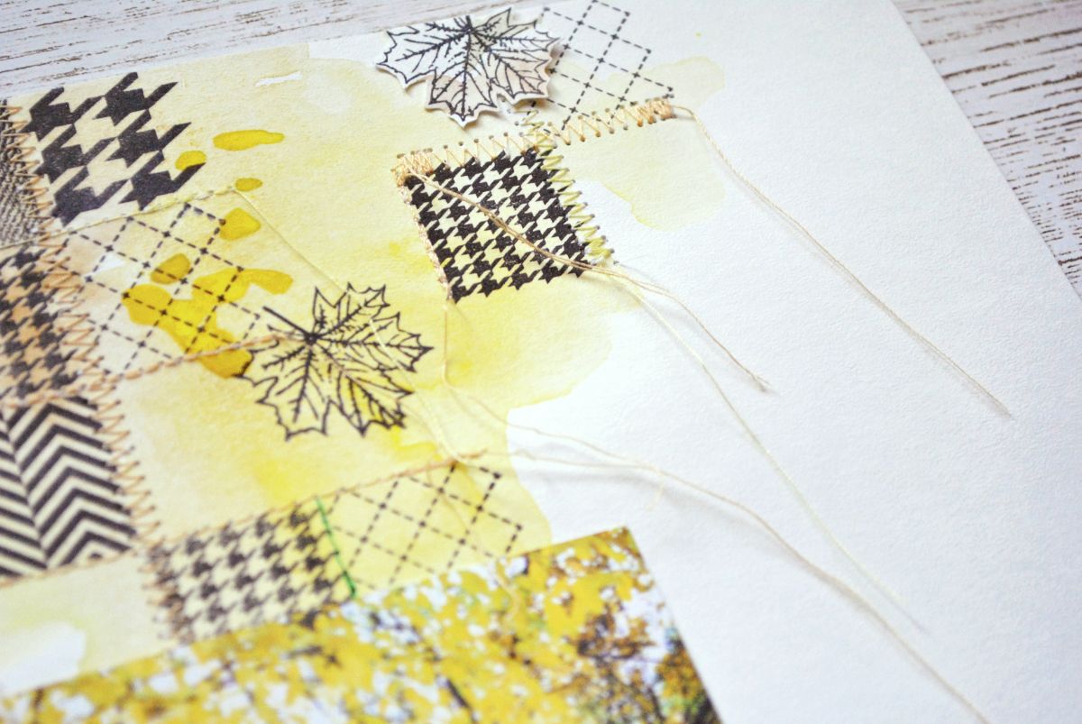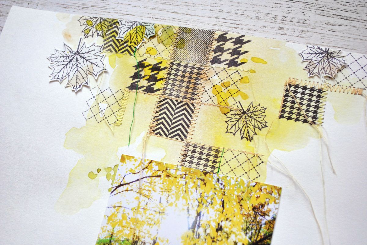 Ориентируясь на уже имеющиеся квадраты, выстраиваю композицию. Конечно, здесь могут и должны быть "разывы", незавершенные строчки. Создаю настроение легкого прозрачного осеннего воздуха. Прикладываю фото, чтобы сразу вписать его в композицию.