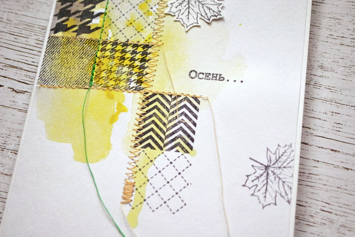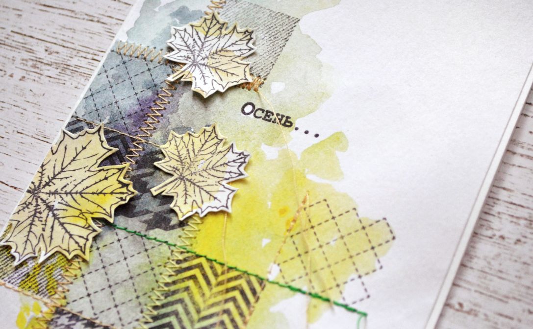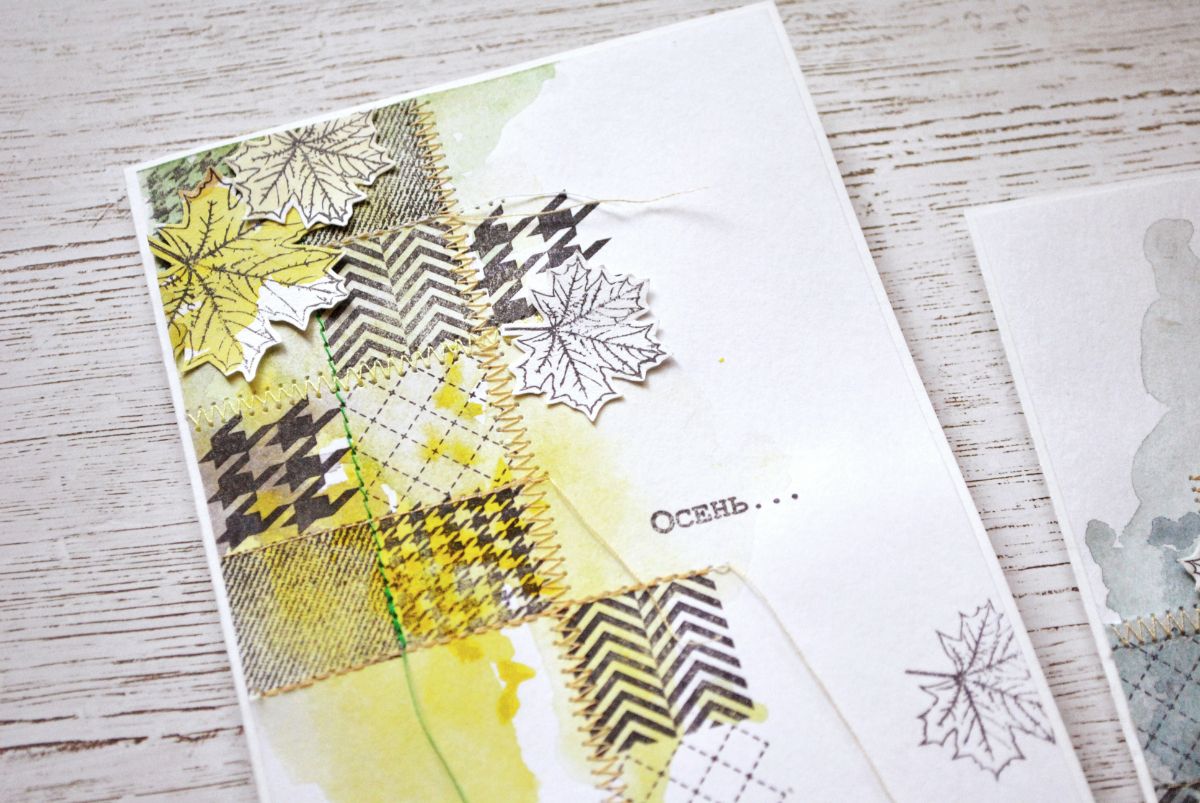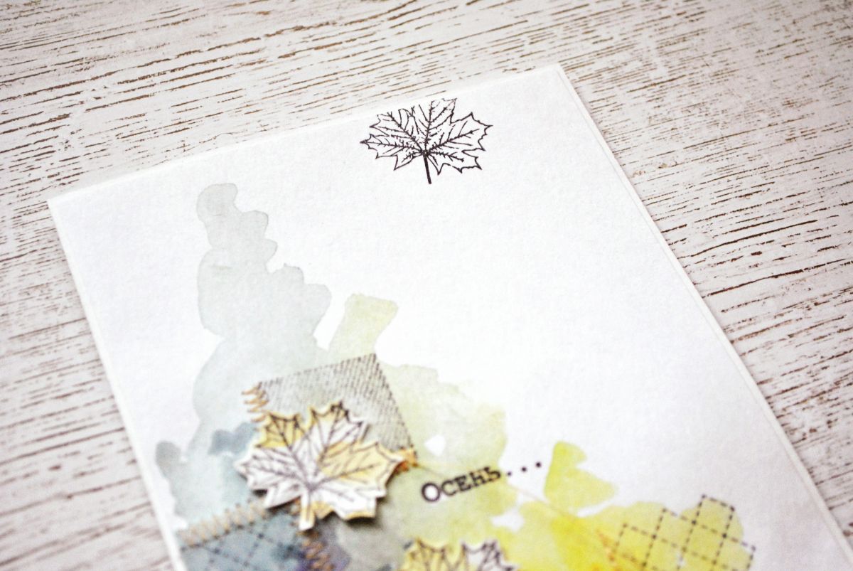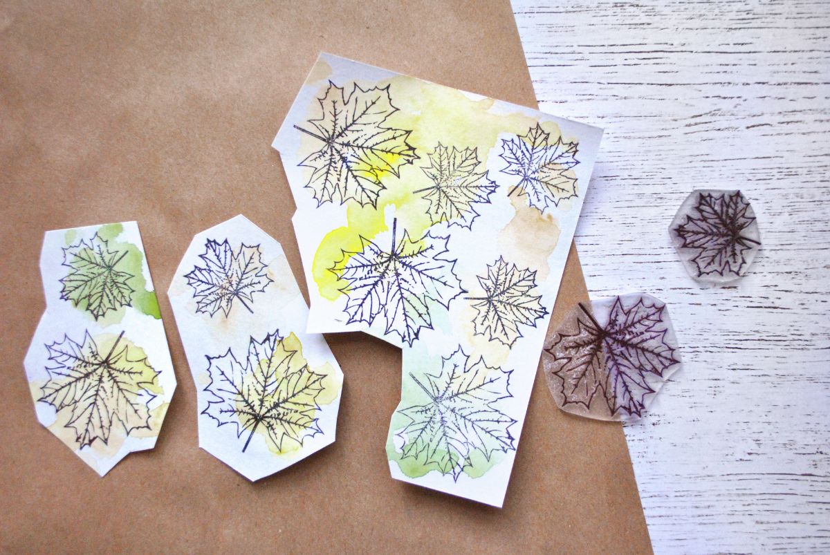 Начинаю собирать декор. Много украшений не будет - мне хотелось, чтобы лоскутный узор из штампов играл ведущую роль. Но без осенних листьев все же не обойтись! Штампую и вырезаю Кленовые листья из слегка, небольшими пятнышками подкрашенной акварелью бумаги (можно использовать, например, тот самый пробник, на котором подбирались цвета в самом начале).