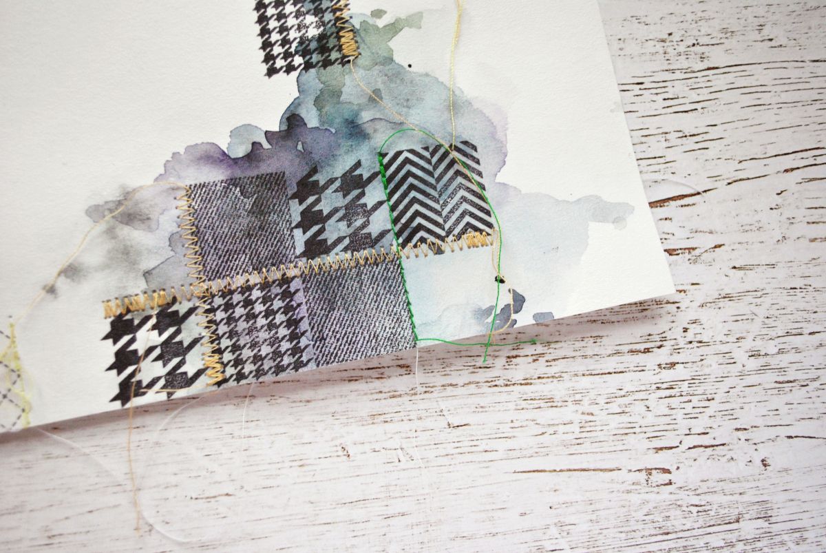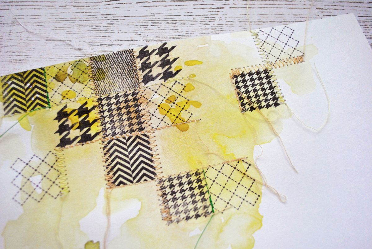 Теперь для более живой имитации пэчворка прокладываю несколько машинных строчек между рядами. Все отштампованные узоры у меня однотонно-черные, поэтому можно разнообразить "шитье" разноцветными нитками (зеленые, желтые, лимонные) и фигурной строчкой-зигзагом.