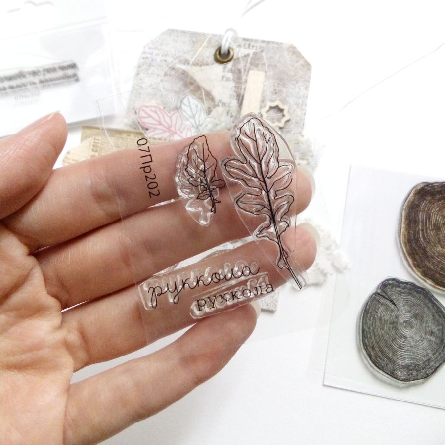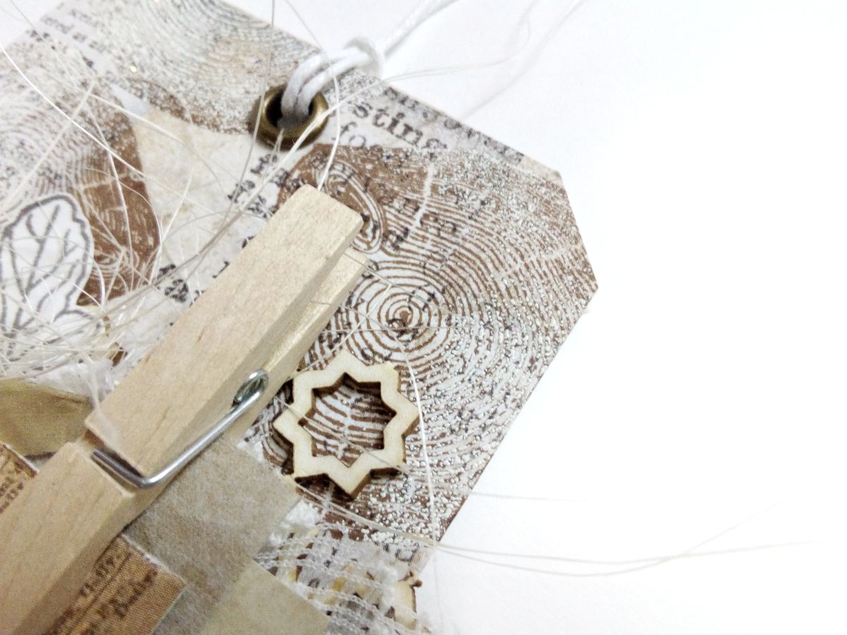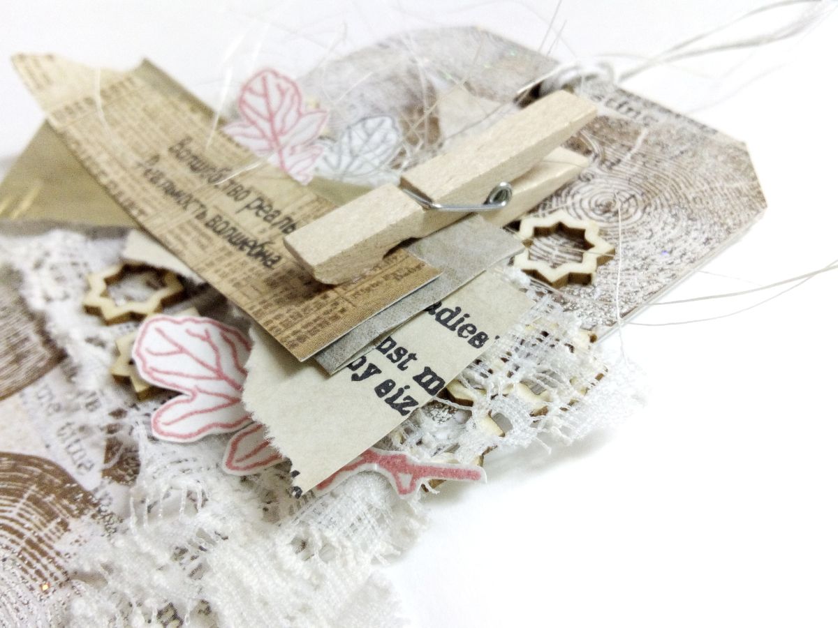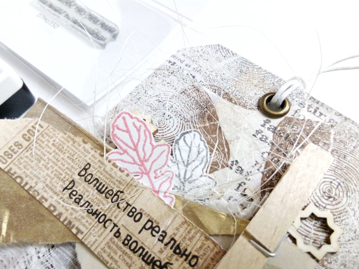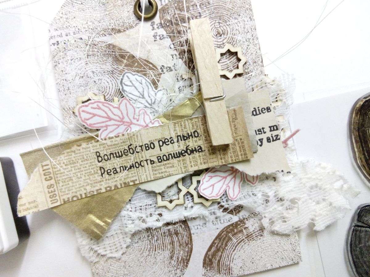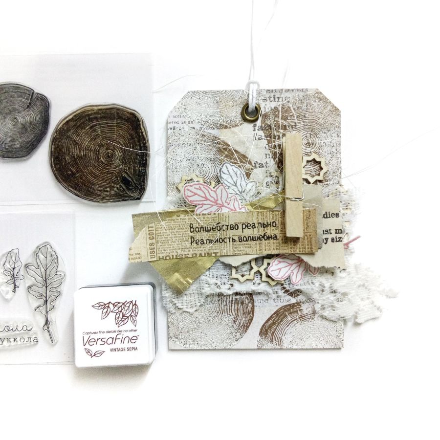 Для основы тега я взяла скрапбумагу с принтом "книжные страницы" и дополнила фон штампом "спилы бревен". Надпись тоже отштампована на скапбумаге с мелкими буквами. И тут соотношение размер букв штампа/размер принта имеет значение! Штамп обязательно должен быть "крупнее", чётче, чтобы надпись выделялась на общем фоне.
