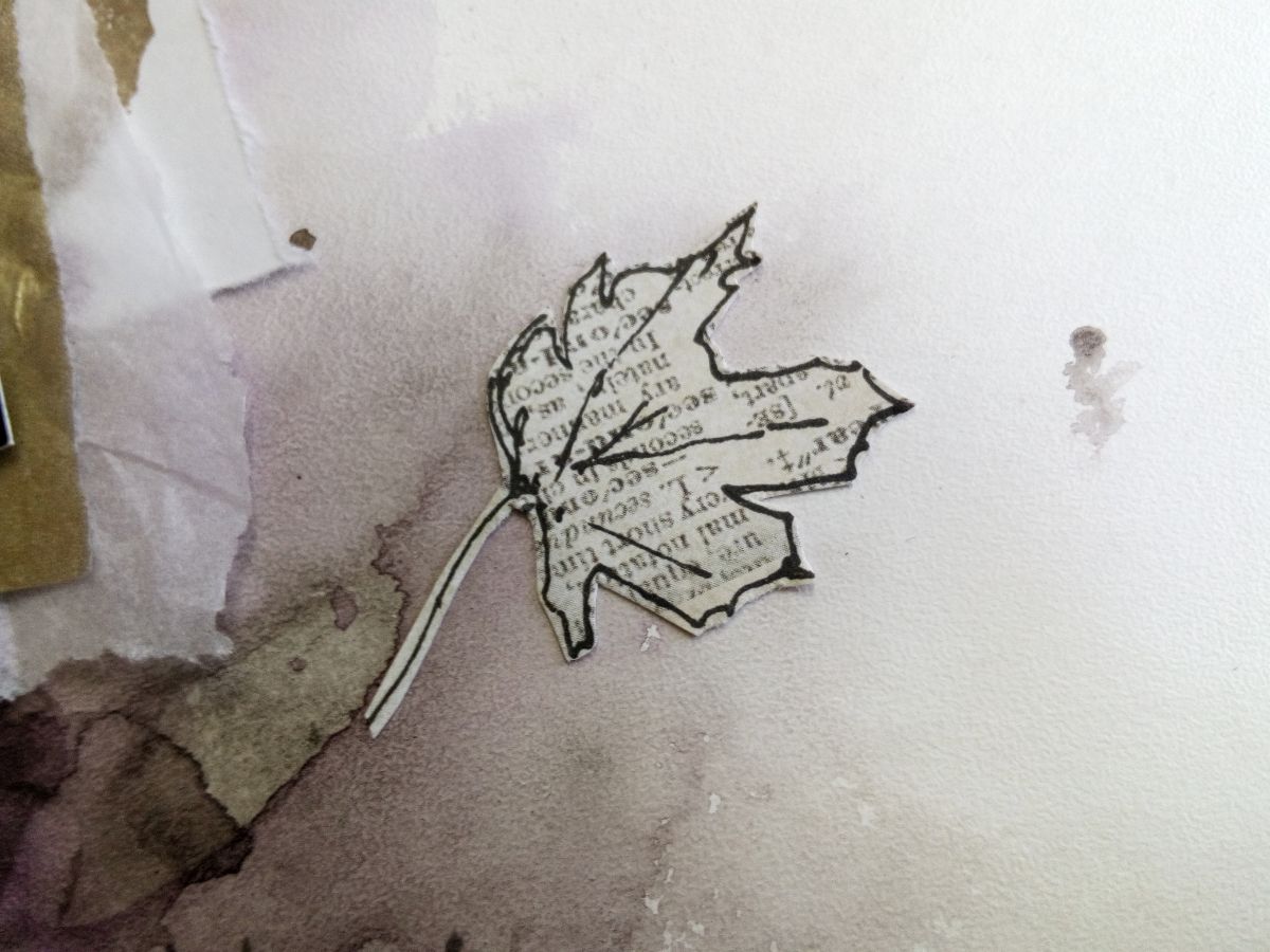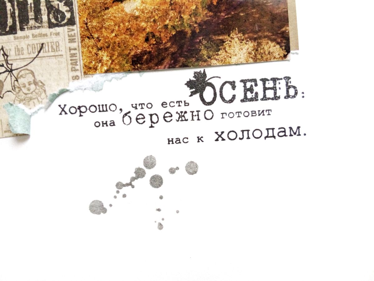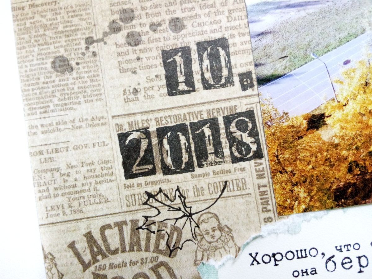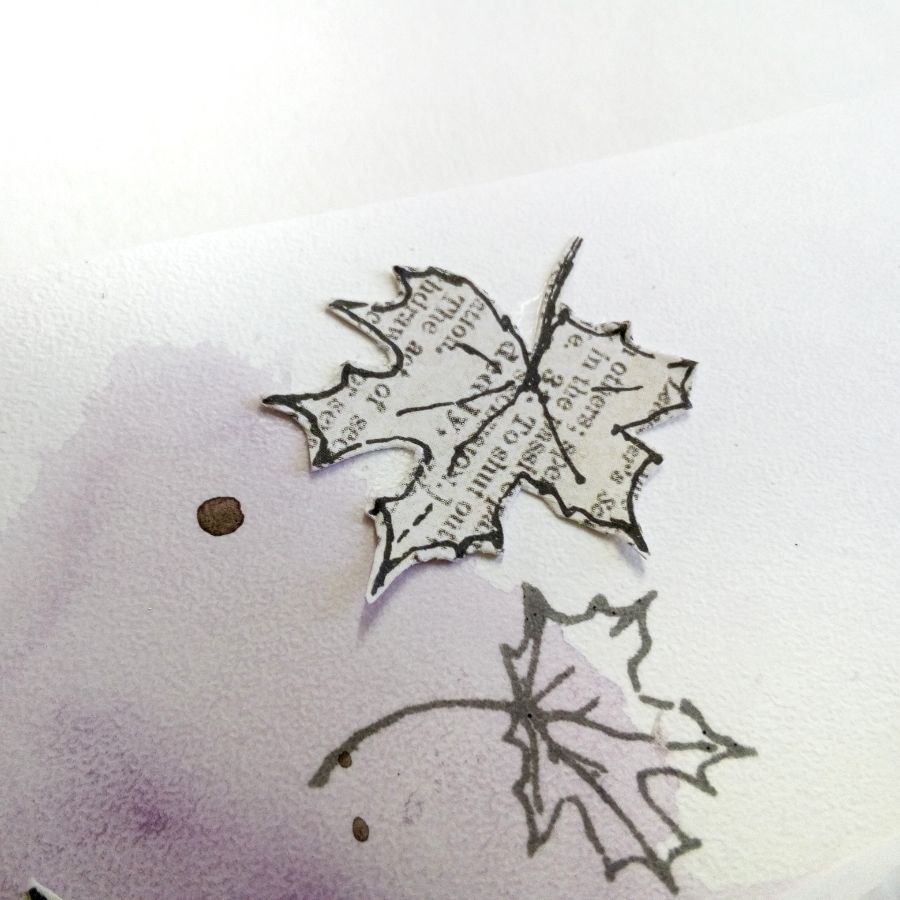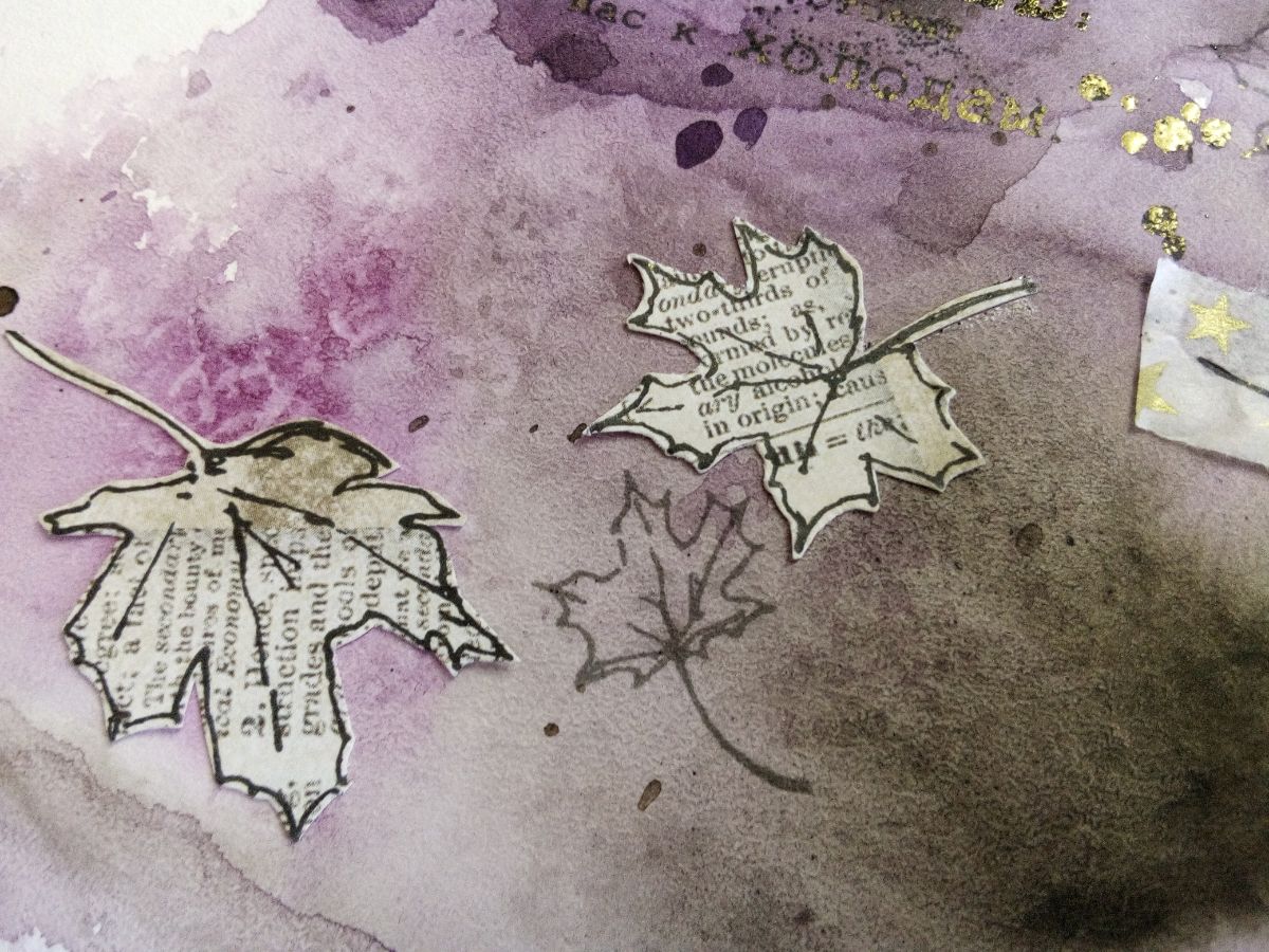 Тут мне понадобился декор из штампов. Но активный акварельный фон странички диктует свои условия: яркие листочки уже не добавишь - "потеряются", а "голая" отштамповка будет смотреться слишком пустой. Поэтому осенние листья я решила отштамповать на скрапбумаге с принтом "книжные страницы". Буквы отлично заполнили пространство штампа, а строки задали направление. Кстати, если у вас четко выверенная композиция и строгие линии, то при штампинге обращайте внимание на то, в каком направлении идут строки внутри штампа. В моём же случае лёгкий хаос лишь украшает работу, ведь осень - дама капризная;)